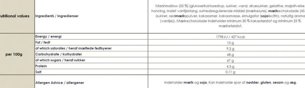 Bløde skumfiduser med ægte vanilje, der smelter i munden. De luftige marshmallows er omgivet af et sprødt lag af mælkechokolade og smelter i munden. Enkeltindpakkede. 9 stk i æsken.
