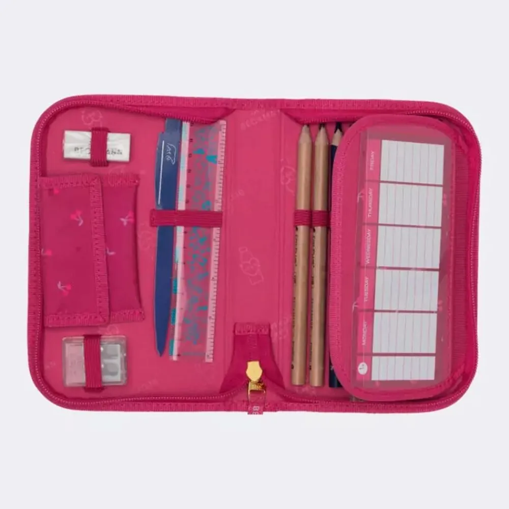 Sættet indeholder: Skoletaske, gymnastik/turtaske, onezip penalhus med fyld og ovalt penalhus, alt sammen i matchende motiver.