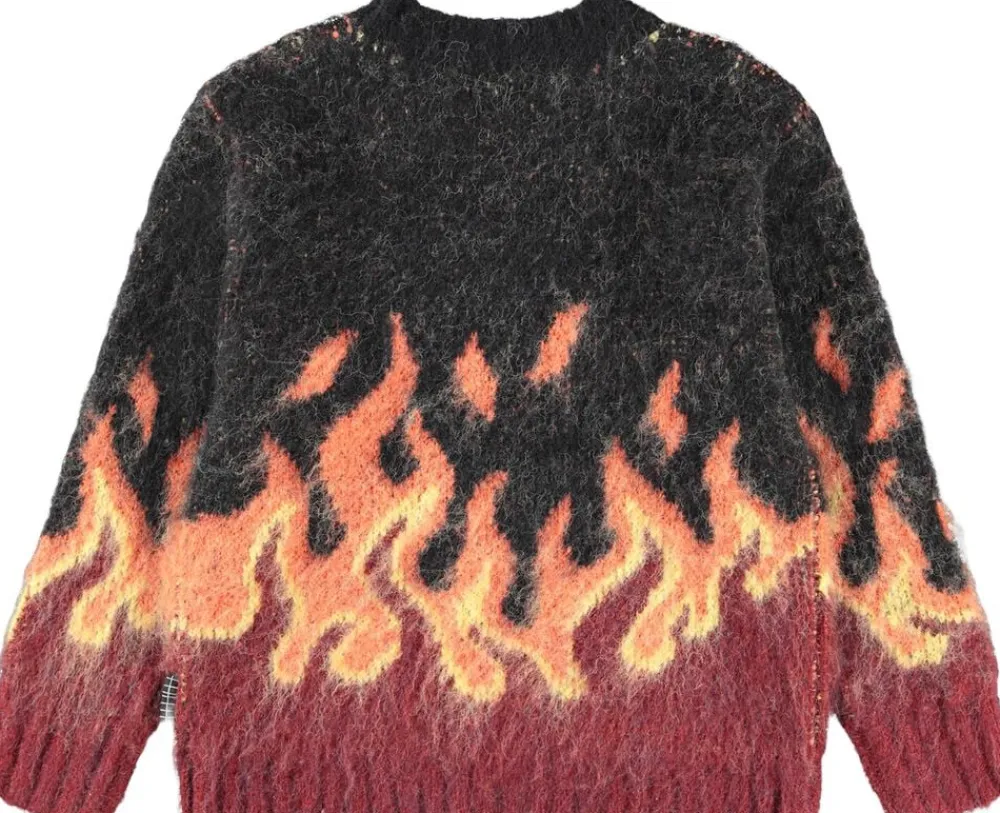 Denne striktrøje fra Molo er fremstillet i en fluffy alpaka uldblanding i røde og sorte nuancer. Trøjen har en rund halsudskæring med ribkant samt rib ved håndled og hofte. Med en løs pasform og et grafisk flammemotiv på ærmer og krop er denne trøje både stilfuld og behagelig.