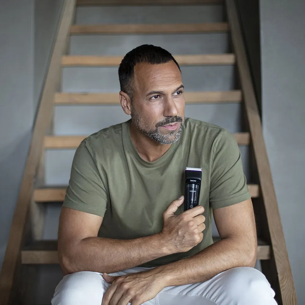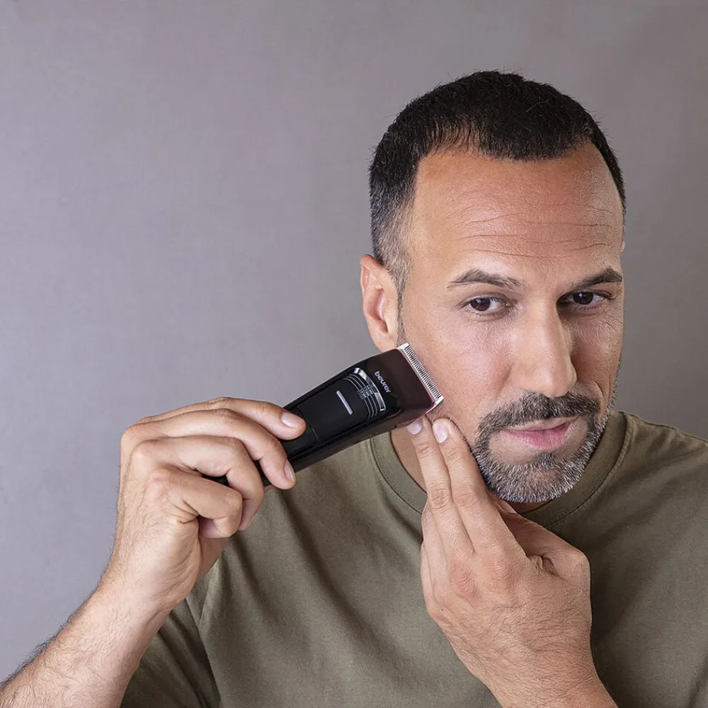 MN5X Men Care Hårtrimmer fra Beurer med 6 klippelængder og 4,5 times brugstid på en opladning. Du får 6 tilbehørsdele med, der i alt giver dig mulighed for 6 trimmelængder: 3, 6, 10, 16, 19 og 25 mm. Der er tilmed en 4-trins finjustering mellem 0,6-2,4 mm. Skæreklinge i høj kvalitetSkæreklingen er udført i rustfrit stål af høj kvalitet, så du er sikret en hurtig og effektiv klipning. Du kan tage skæretilbehøret af og skylle det under rindende vand. 4,5 times brug på en opladningHårtrimmeren har et kraftfuldt genopladeligt litium batteri. Du kan bruge hårtrimmeren i 4,5 time mellem opladningen. Det tager 3,5 time at oplade. Du kan følge med i batteristatus og ladestatus på LED-displayet. Der er tilmed rejselåsdisplay, så du kan se om rejselåsen er slået til eller fra. Hårtrimmeren kommer inklusiv en praktisk opbevaringstaske, olie og rensebørste. Produktet måler 18. 5 x 4. 5 x 5 cm. Du får 3 års garanti på produktet.