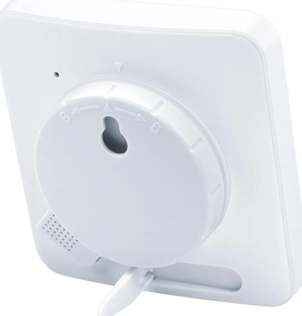 HM 16 har en indbygget stander og kan også monteres på væggen. Der medfølger 1 stk. CR2025 batteri.