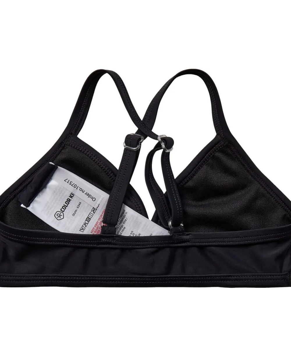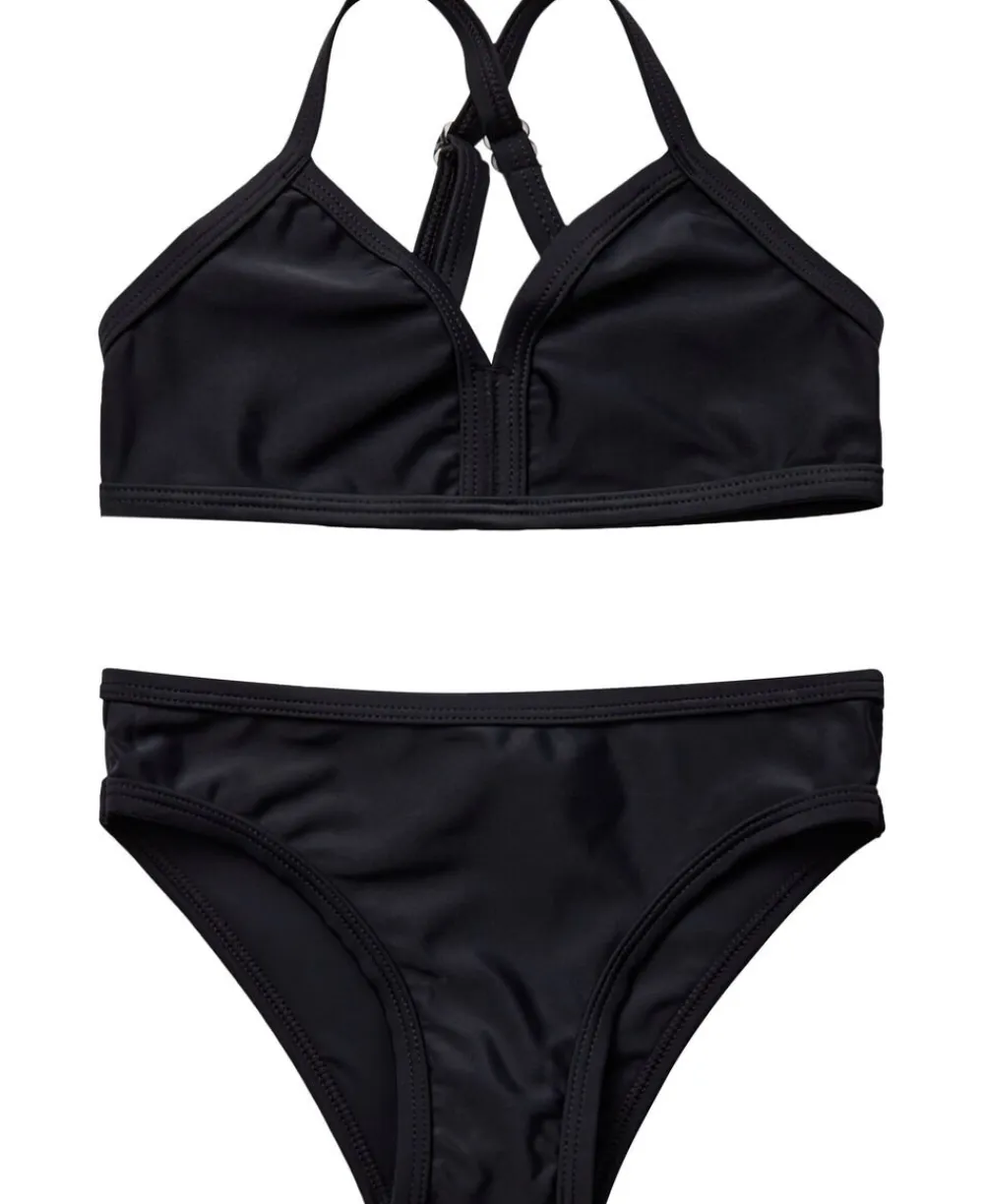 Bikini fra Color Kids. Bikinitoppen smalle ensfarvede kanter og skulderstropper, som former et kryds bagpå. Bikinibukserne har en tynd ensfarvet taljekant. Bikinien er ensfarvet og er hurtigttørrende.