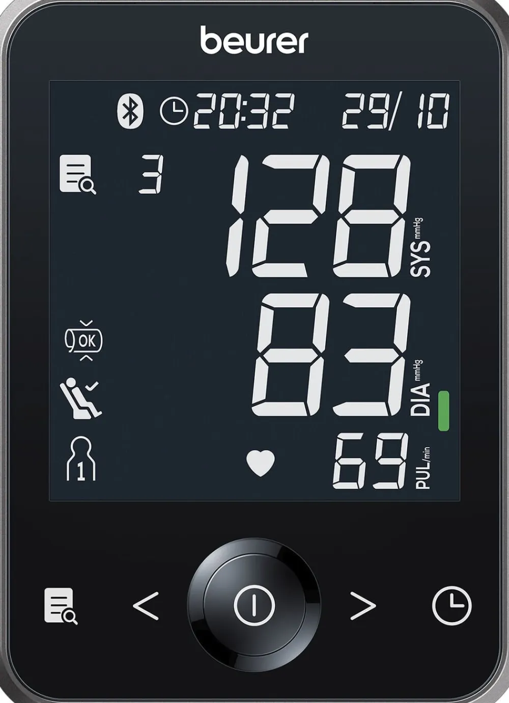 Beurer BM 64 blodtryksmåler til overarm med smart inflationsteknologi, hvor målingen foretages under oppustning af manchetten for et hurtigere resultat.