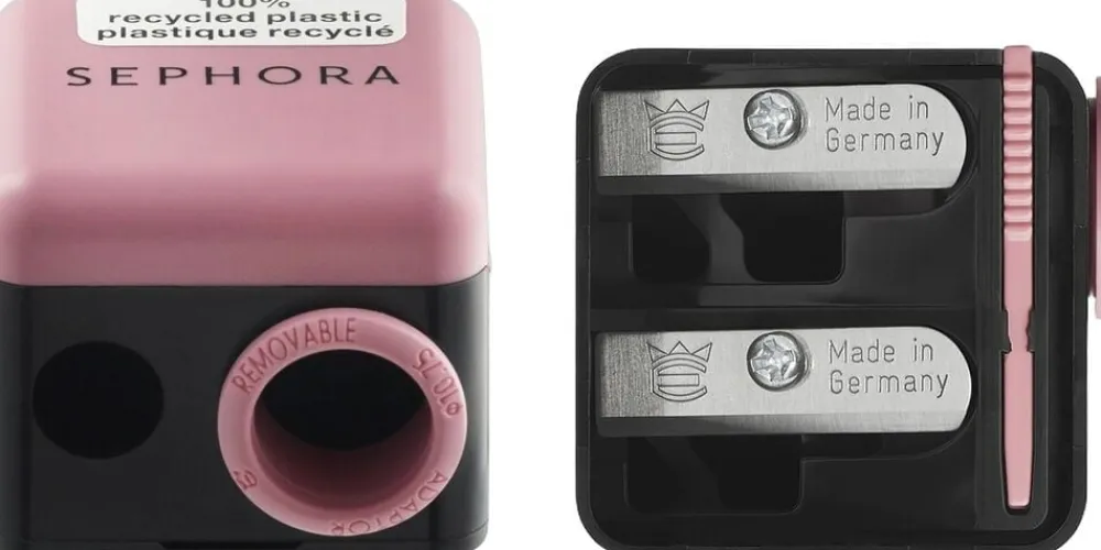 Den nye SEPHORA COLLECTION-blyantspidser er fremstillet af 100 % genbrugsplast, og dens adapter kan spidse 3 blyantdiametre med præcision.