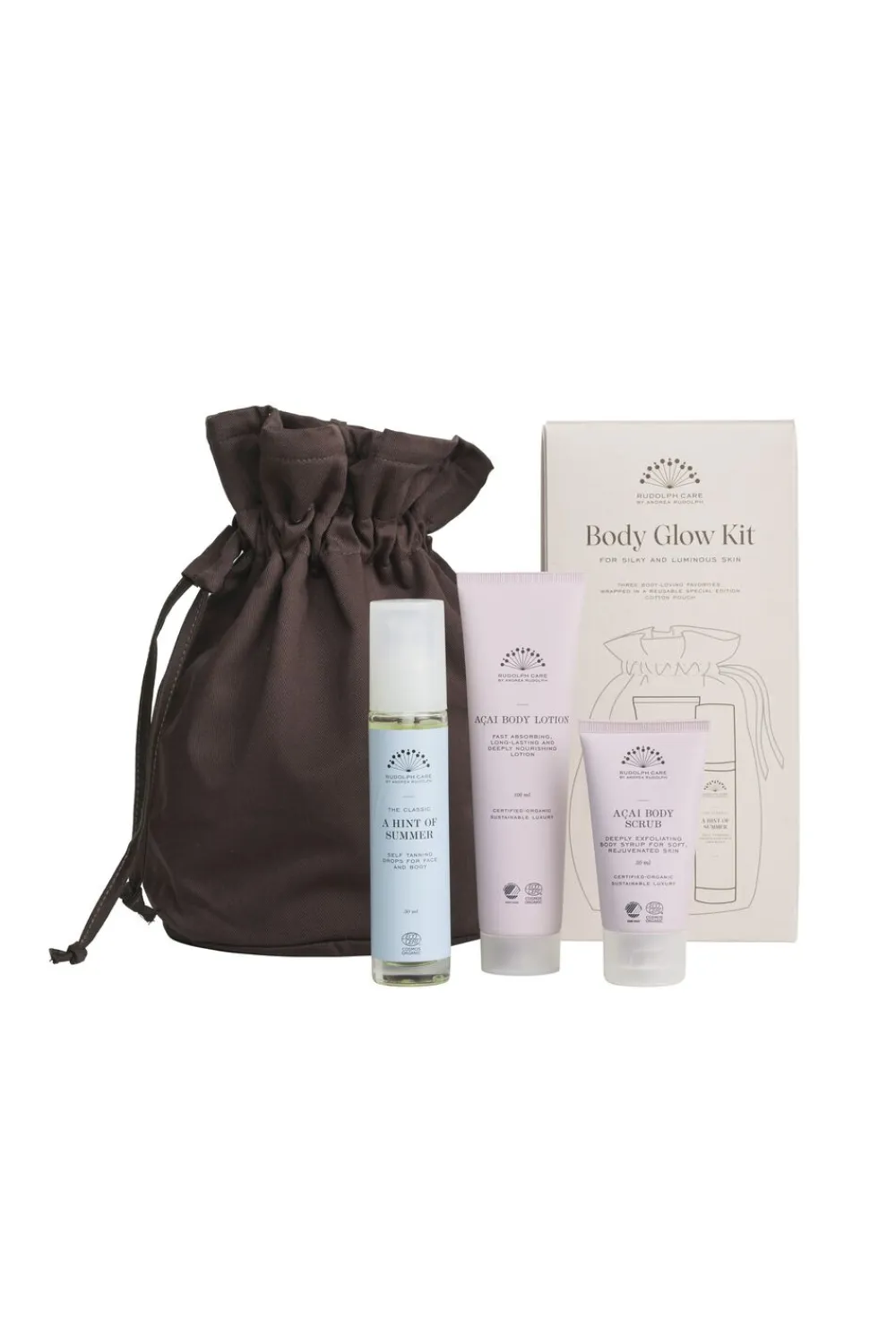 Body Glow Kit er gaven, som samler tre Rudolph Care-favoritter, der lader dig genfinde sommergløden og den silkebløde, fugtmættede hud året rundt.