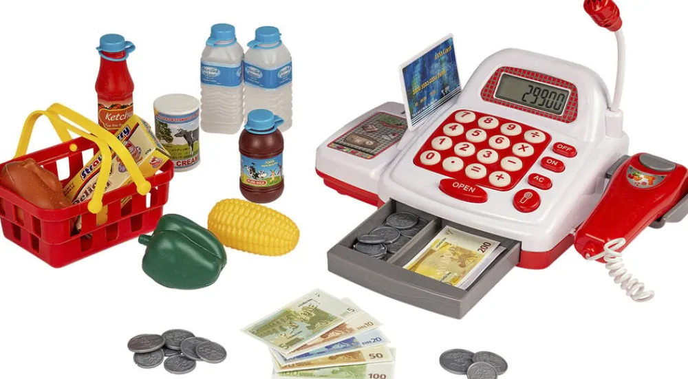 Kasseapparat med tilbehør Med mikrofon. regnemaskine, scanner, kreditkort, penge, indkøbskurv og varer Bruger 3 stk AA-batterier