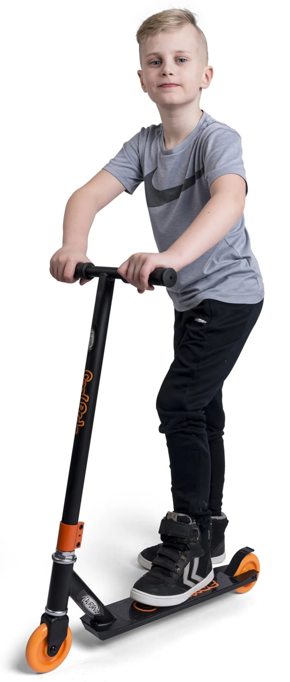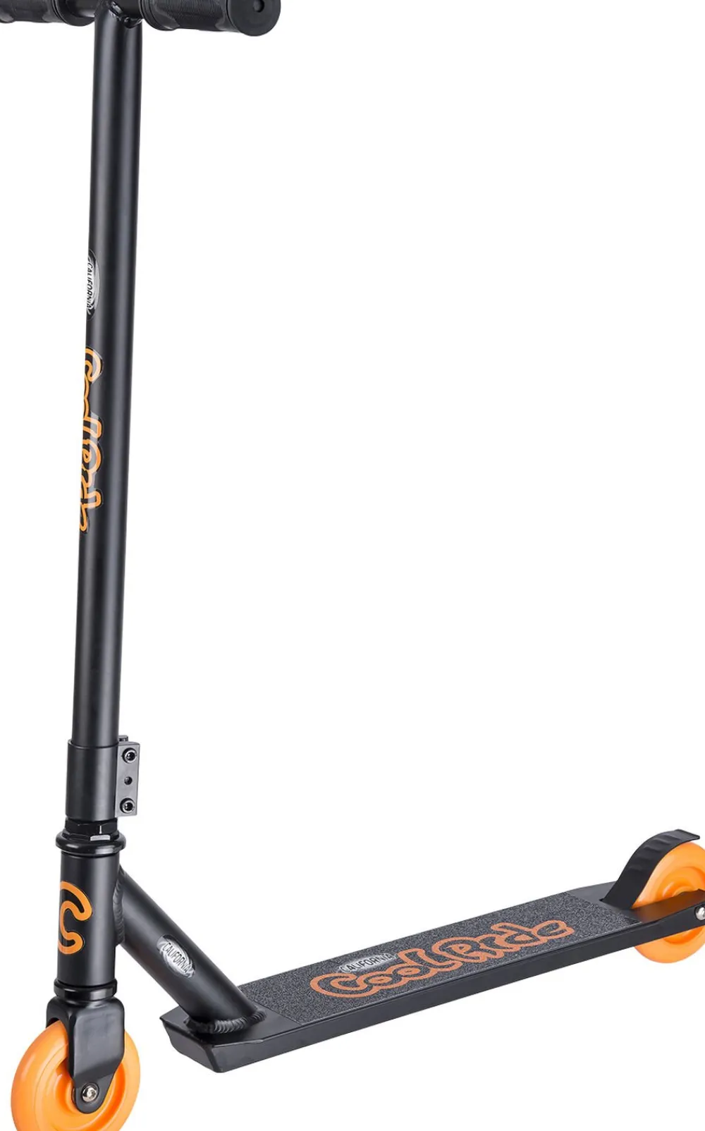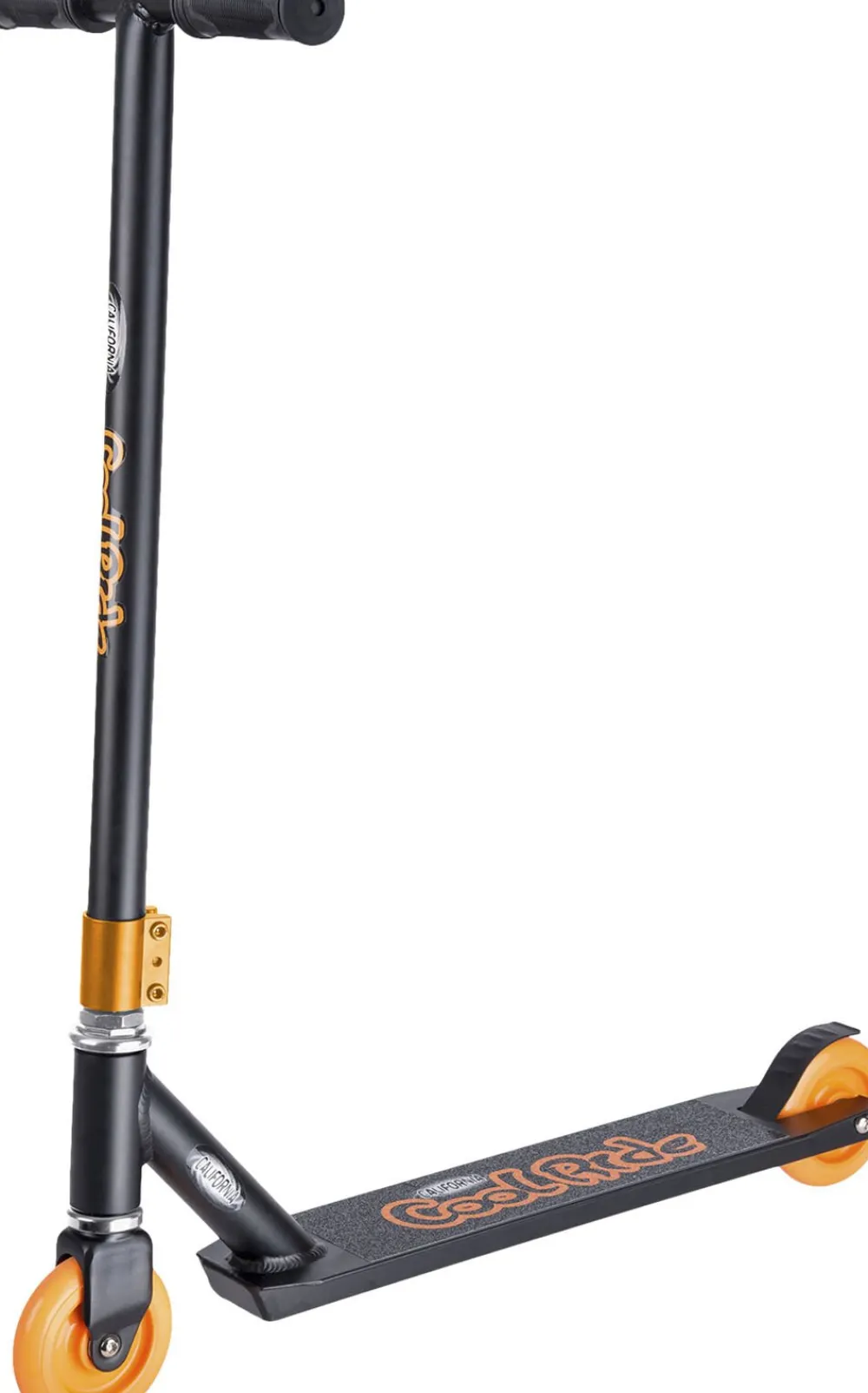 California Cool Ride stuntløbehjul Specifikationer: Aluminiumdeck med mat coating og griptape 100 mm PU-hjul med PP core ABEC 7 chrome kuglelejer 3-dobbelt clamp Svejseforstærket T-bar Skridsikre gummihåndtag Kraftig bremse Bæreevne: 100 kg EN14619 godkendt sportsløbehjul