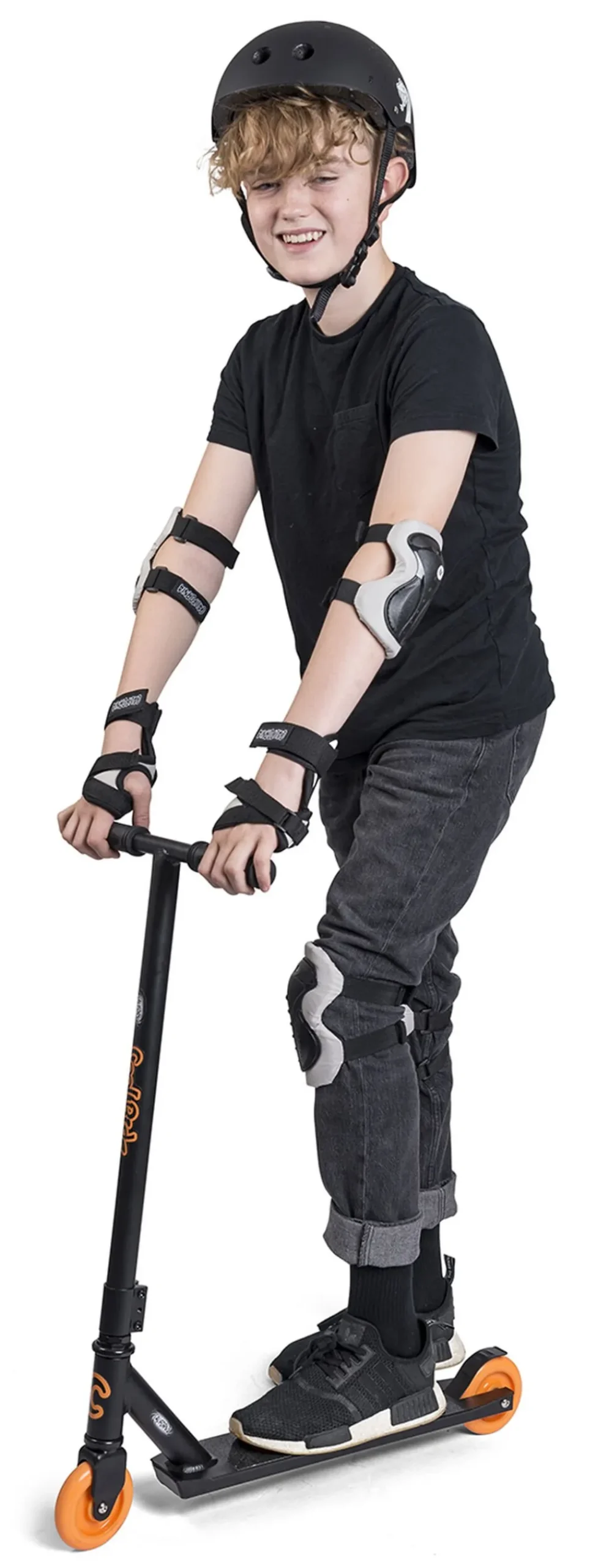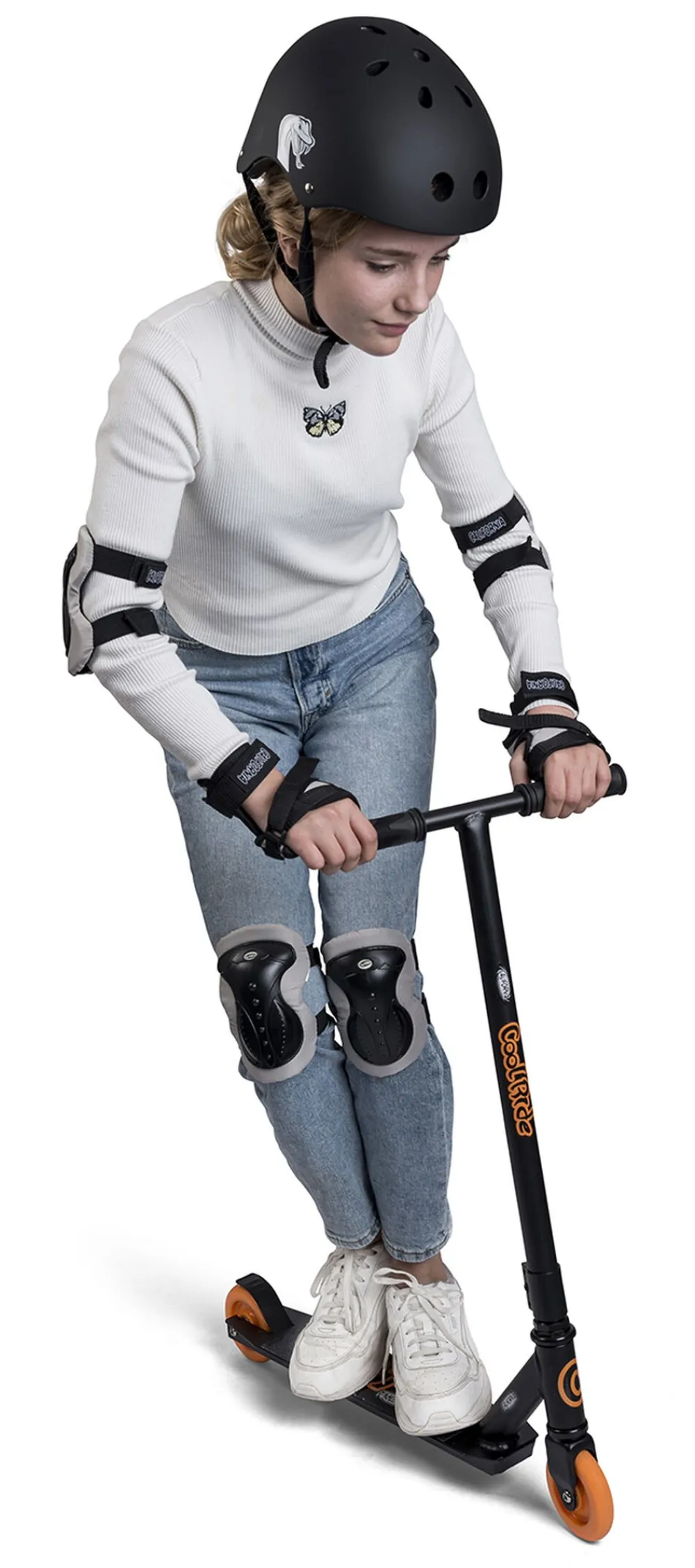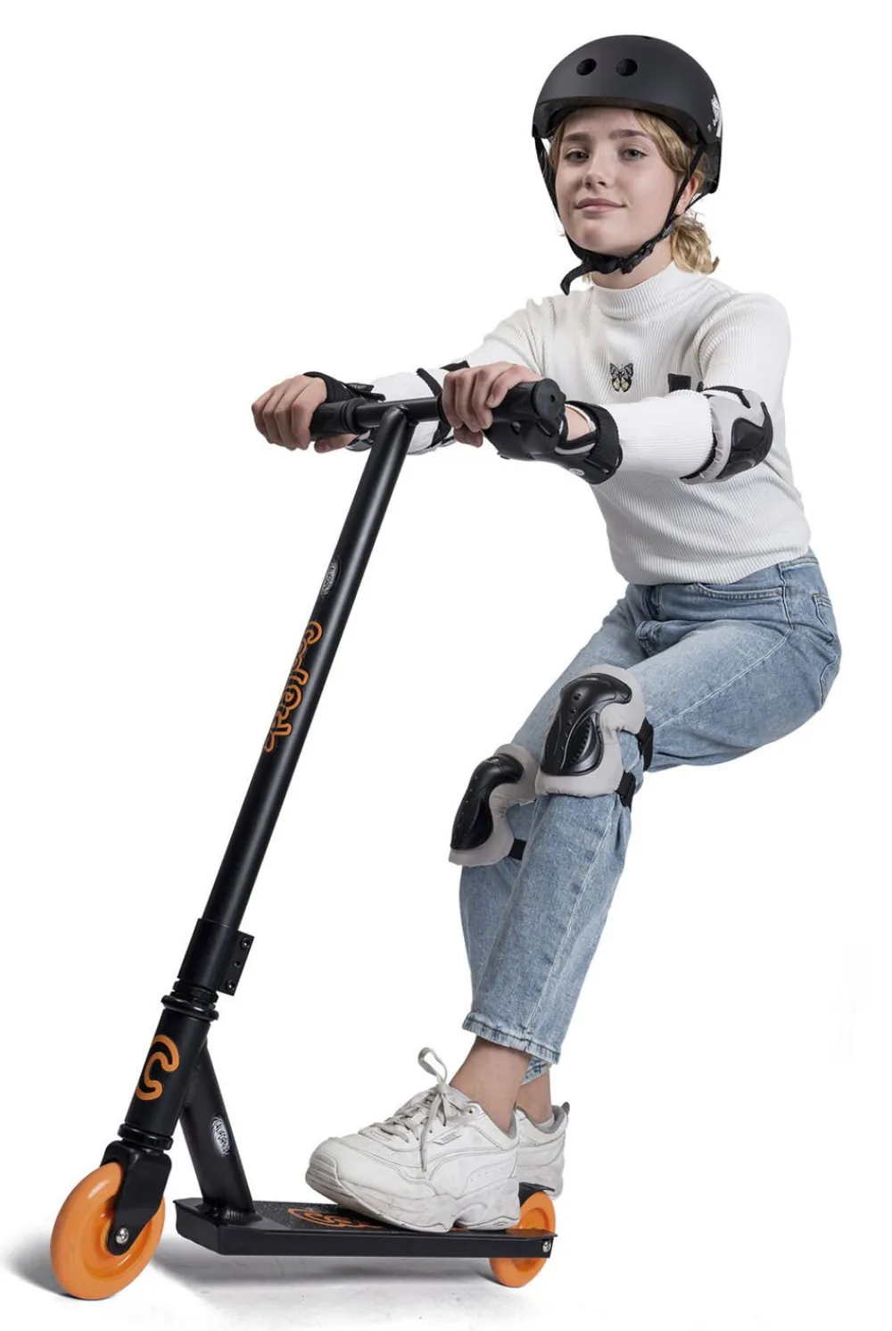 California Cool Ride stuntløbehjul Specifikationer: Aluminiumdeck med mat coating og griptape 100 mm PU-hjul med PP core ABEC 7 chrome kuglelejer 3-dobbelt clamp Svejseforstærket T-bar Skridsikre gummihåndtag Kraftig bremse Bæreevne: 100 kg EN14619 godkendt sportsløbehjul