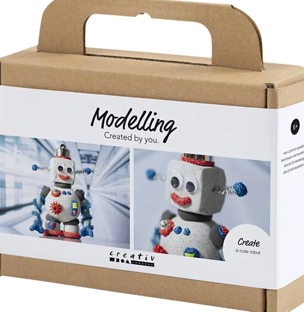 Med vores Creativity in a Box kan du og børnene lave den sejeste, lille robot, som er fuld af sjove detaljer. Indeholder alle de materialer I skal bruge, og al den vejledning I behøver. Hvordan ser en robot egentlig ud? Åbn vores Creativity in a Box, og udforsk det sammen. Her kan I skabe jeres helt egen robot i stone clay et unikt modelleringsmateriale, som giver en imponerende sten-effekt. Det er komplet selvhærdende og bliver hårdt og fast efter ca. 24 timer. Tørrer det undervejs, ælter I det bare med lidt vand det er supernemt. I kan også lave de sjoveste dimsedutter og dingenoter. Byg dem af piberensere, perler, Silk Clay® og Foam Clay® og dekorer robotten i lige den stil, I ønsker. Resultater bliver den vildeste robot med masser af personlighed.