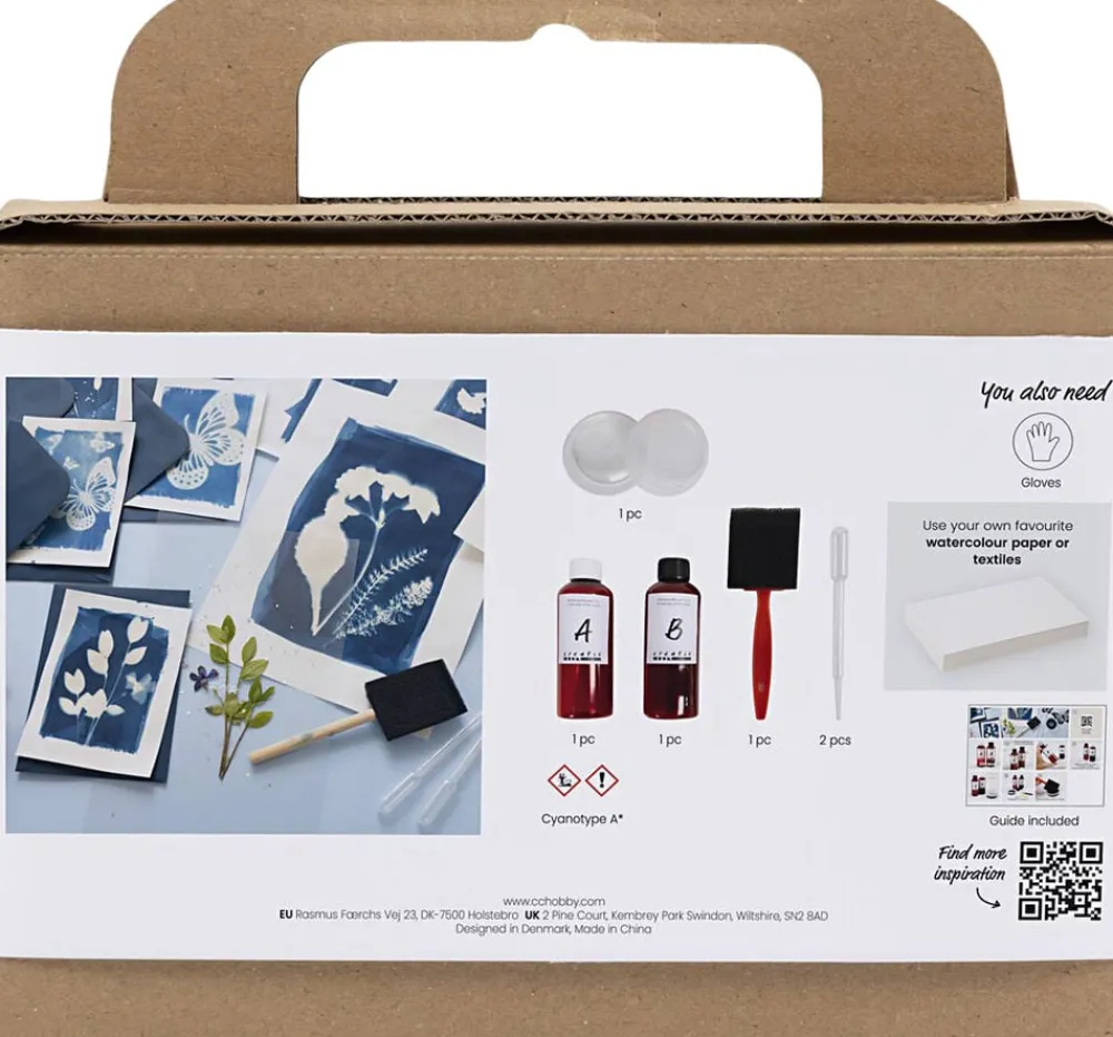 Med dette kit kan du nemt prøve kræfter med cyanotypi. Indeholder alt det tilbehør du skal bruge, og al den vejledning du behøver. Det eneste, du selv skal have klar, akvarelpapir eller bomuldsstof. Drømmer du om at skabe dine egne cyanotypi-prints? Så prøv vores smarte tool kit. Her får du det vigtigste tilbehør til at skabe smukke, blå prints ved hjælp af sollys. Teknikken både enkel og fascinerende. Tag først de to flasker med jernsalte (ammoniumjerncitrat og kaliumferricyanid) mix dem med vand og lad dem stå 24 timer inden brug. Resultatet er en lysfølsom væske, som du selv kan aktiverer med solens kraft. Prøv det fx på papir, stof, papir eller æg. De dækkede områder forbliver kridhvide, mens solens stråler forvandler de eksponerede dele til dybe blå toner. Husk: Brug handsker og evt. briller, da væsken kan genere øjne og hud.