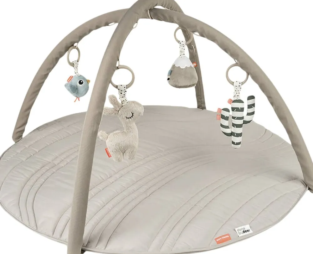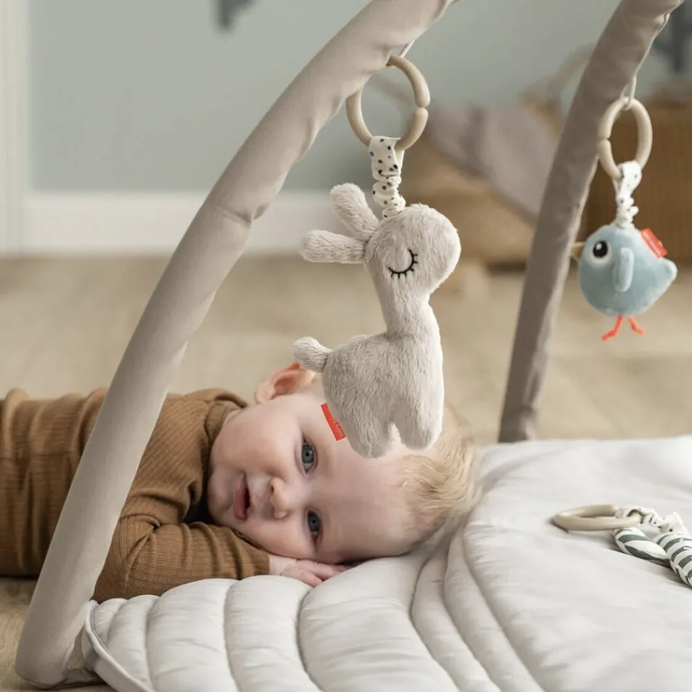 Rør, grib, lyt og se – dette aktivitetsstativ med blødt tæppe vil stimulere og fastholde dit barns interesse med alle de søde og sjove aktiviteter. Det medfølgende legetøj kan hænges i 13 forskellige positioner på de 2 buer så det hele tiden passer til dit barns alder og udvikling. Opdag den knitrende lyd når dit barn griber ud efter Lalee eller den lille kaktus, hør Birdees søde klokke og lad dit barn have det sjovt med at fange sit spejlbilledet i det lille spejl.