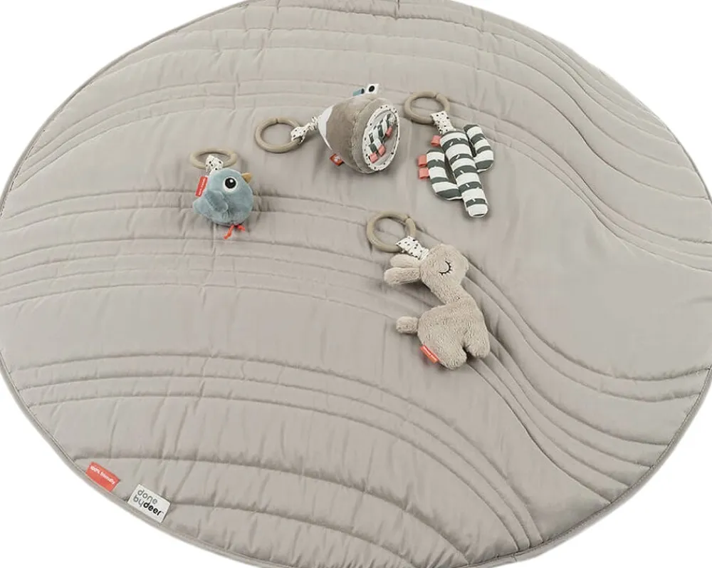 - Materiale:Legetæppe: 100% polyester. Legetøj: Stof: 80% bomuld 20% polyester. På