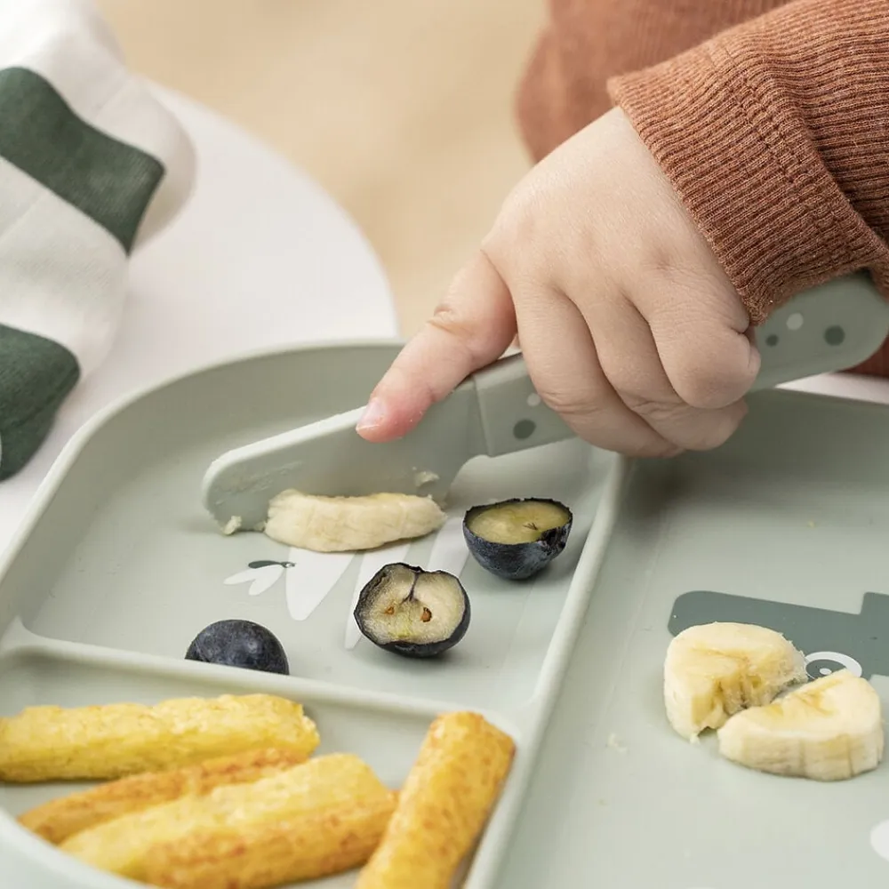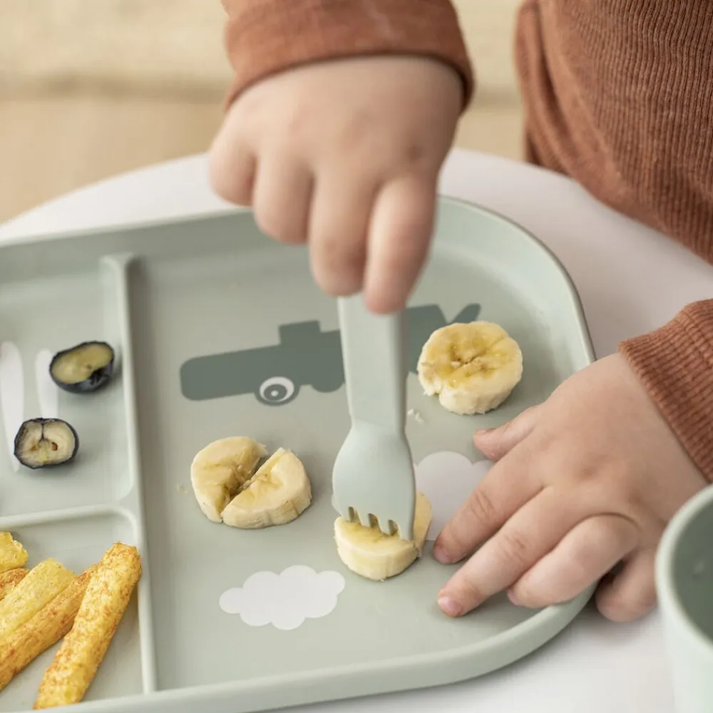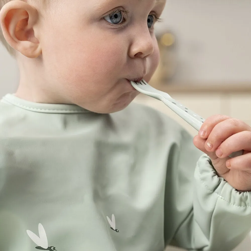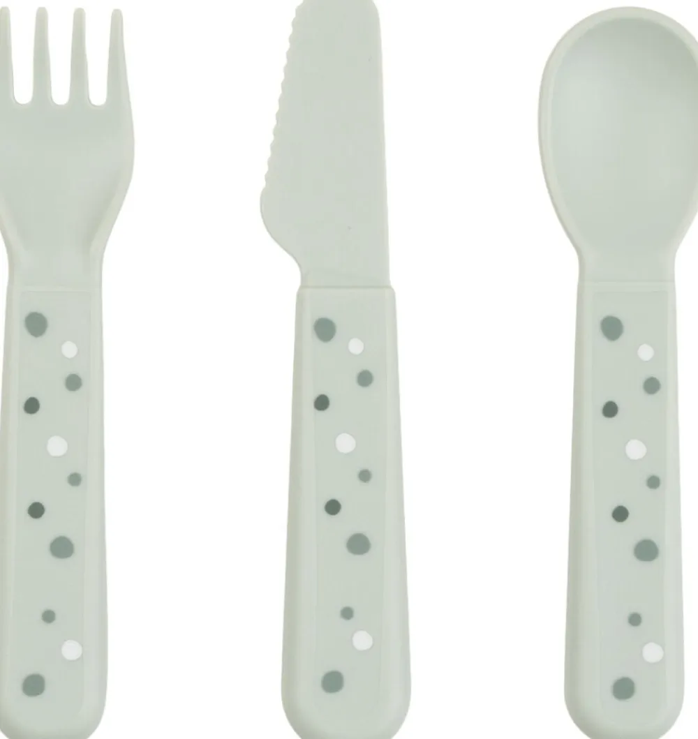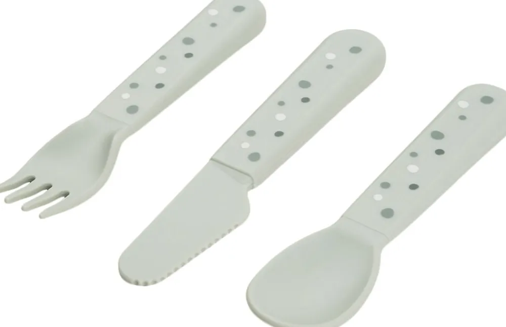 Foodie bestiksættet med Happy dots har afrundede kanter, som gør det sikkert og behageligt for dit barn at øve sig i at spise med bestik. Børnebestiksættet passer perfekt til små hænder og er gennemtestet af børn. Det søde bestiksæt til babyer og tumlinger består af en ske, en gaffel en og kniv. Efter utallige familiemiddage og børnefester kan bestikket affaldssorteres som plast og genanvendes til fremstilling af nye hverdagsprodukter. Det seje, grønne bestiksæt er pyntet med legende Happy dots, som gør ethvert måltid til en fest. Bestikket har en mat, silkeblød overflade og matcher resten af Foodie kollektionen.