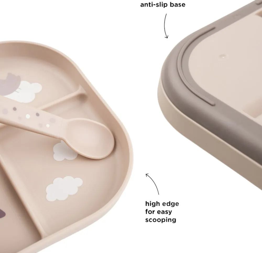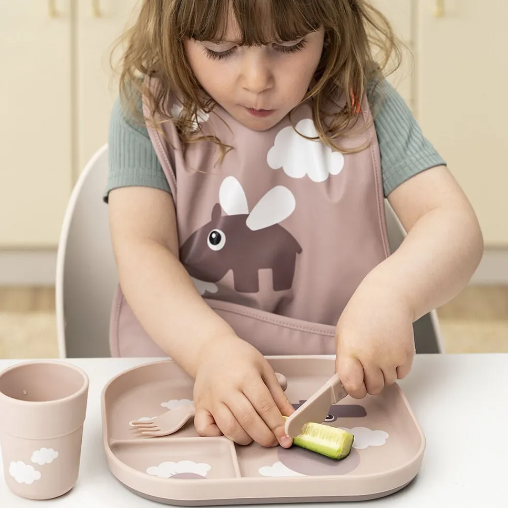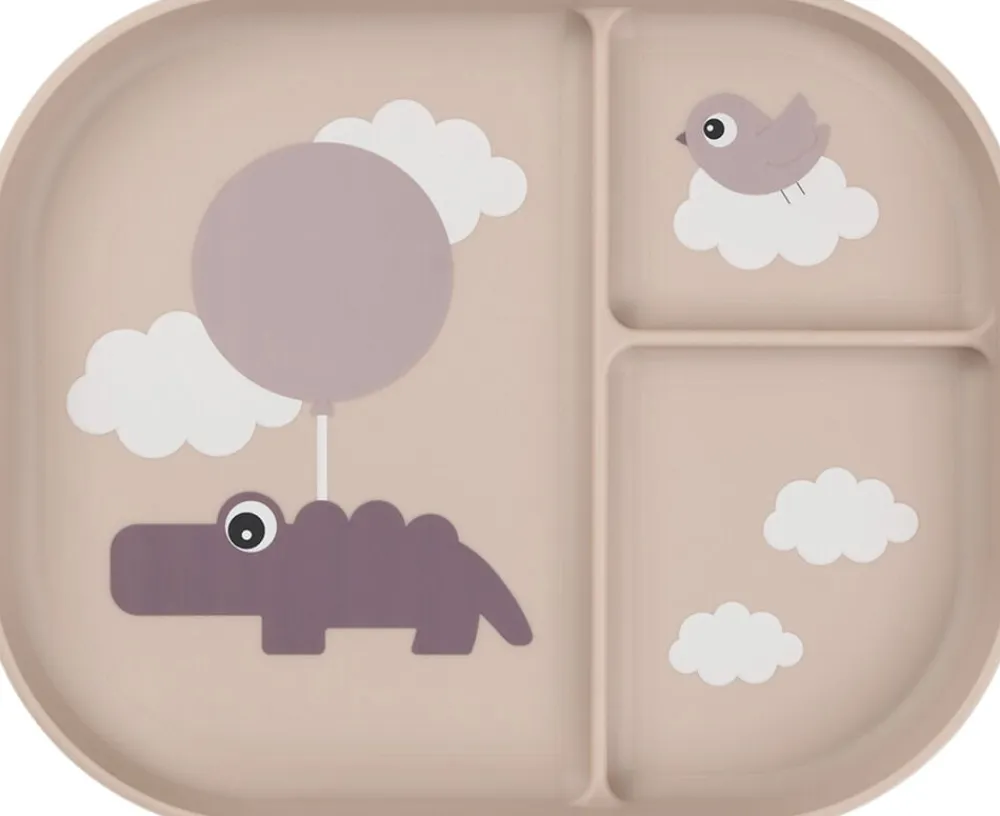 Børnene ved bordet vil elske at spise et måltid af den ruminddelte Foodie tallerken. Et opdelt måltid hjælper dit barn til at fornemme og forstå forskellige smage og konsistenser. Fordel dit barns mad, og lad hvert rum holde maden på plads. Tallerkenens høje kanter hjælper dit barn med at fange maden, mens den praktiske, skridsikre bund sørger for, at tallerkenen bliver, hvor den skal. Tallerkenen er designet til hverdagslivet med børn og tåler både opvaskemaskine og mikroovn. Den ruminddelte, pudderfarvede tallerkener har et legende Happy clouds-motiv. Croco og Birdee udforsker en verden i skyerne og inviterer dit barn til at opleve nye smage og konsistenser. Bundens mørke pudderfarve skaber en fin, tofarvet detalje.