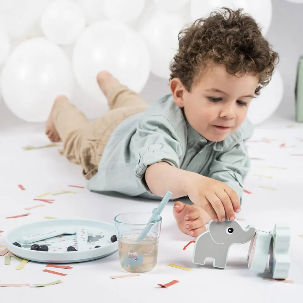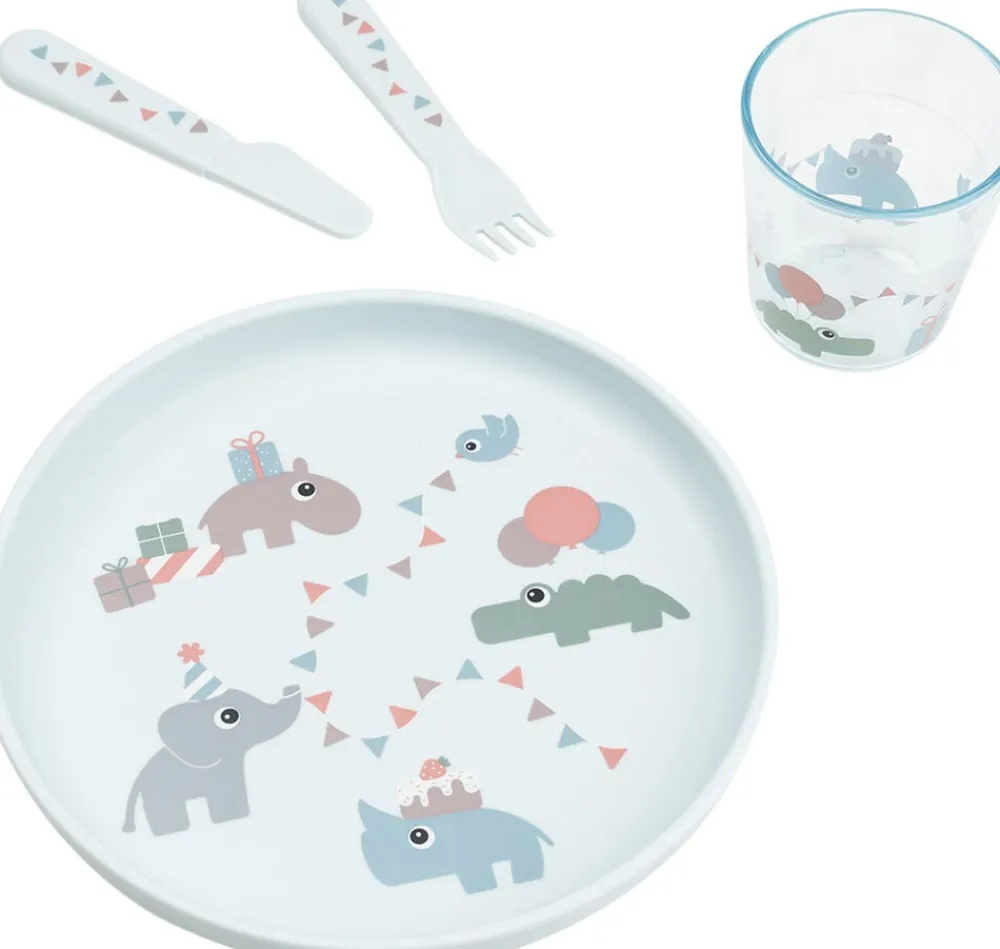 - Materiale:Tallerken: 100% fødevarekvalitet PP med antislip TPE. Bestik: 100% fød