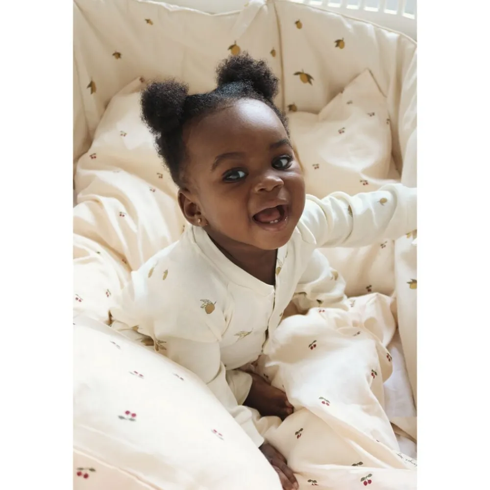 Mål: 70 x 100 cm. Baby sengetøj fremstillet i 100 % økologisk bomuld. Sættet indeholder et dynebetræk og et matchende pudebetræk. Hvert sengesæt leveres i en matchende stoftaske. Vaskeanvisning: Kan vaskes ved max. 60 grader.. Vi anbefaler, at sengetøjet vaskes med lynlåsen lukket for at sikre, at produktet holder form.