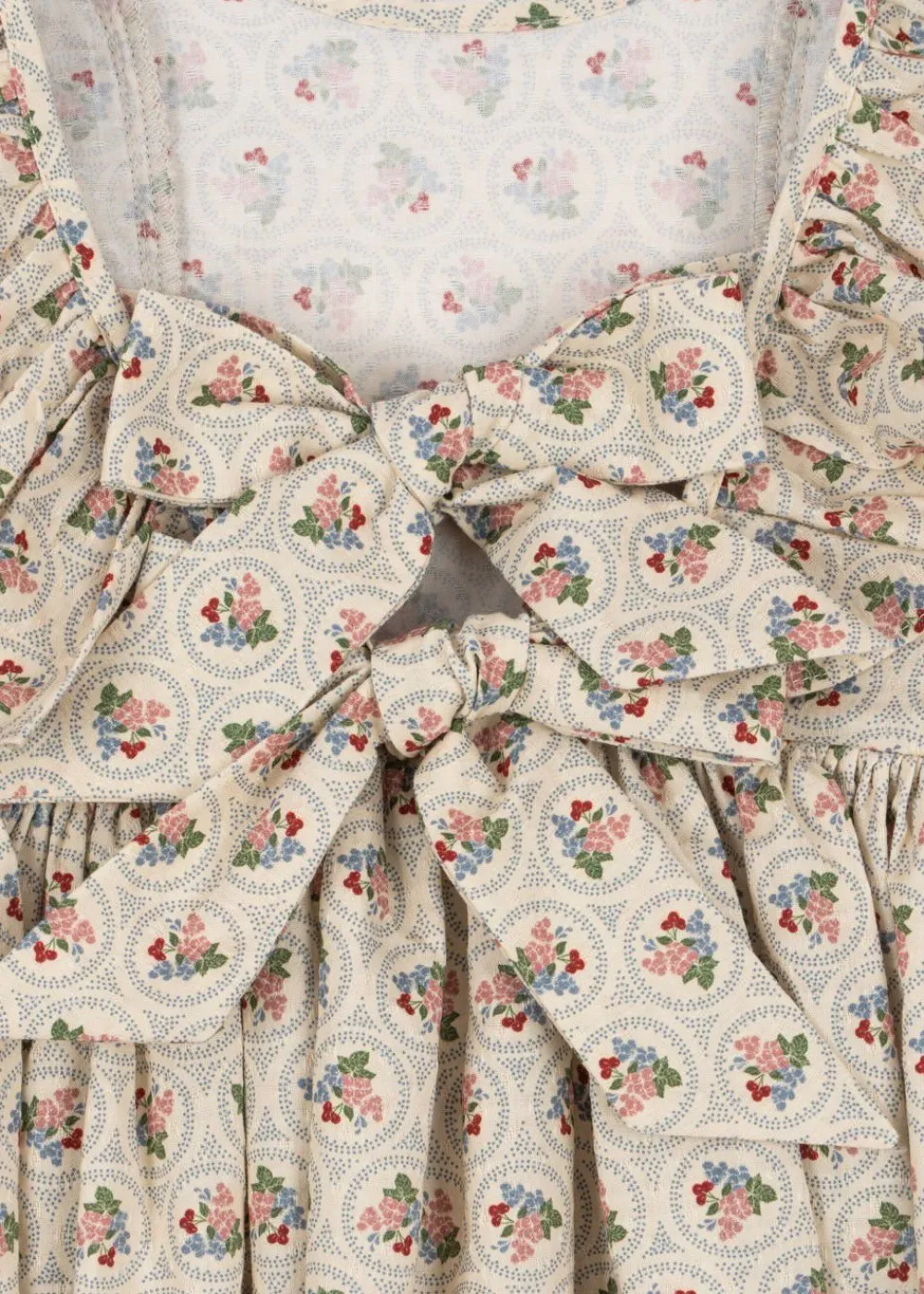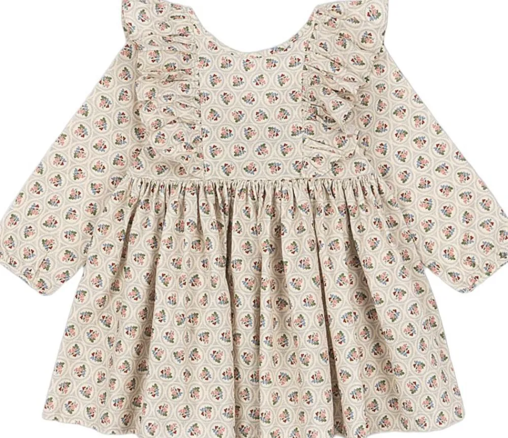Soft organic cotton dress with frill details at the sleeves and bow details in the back.
