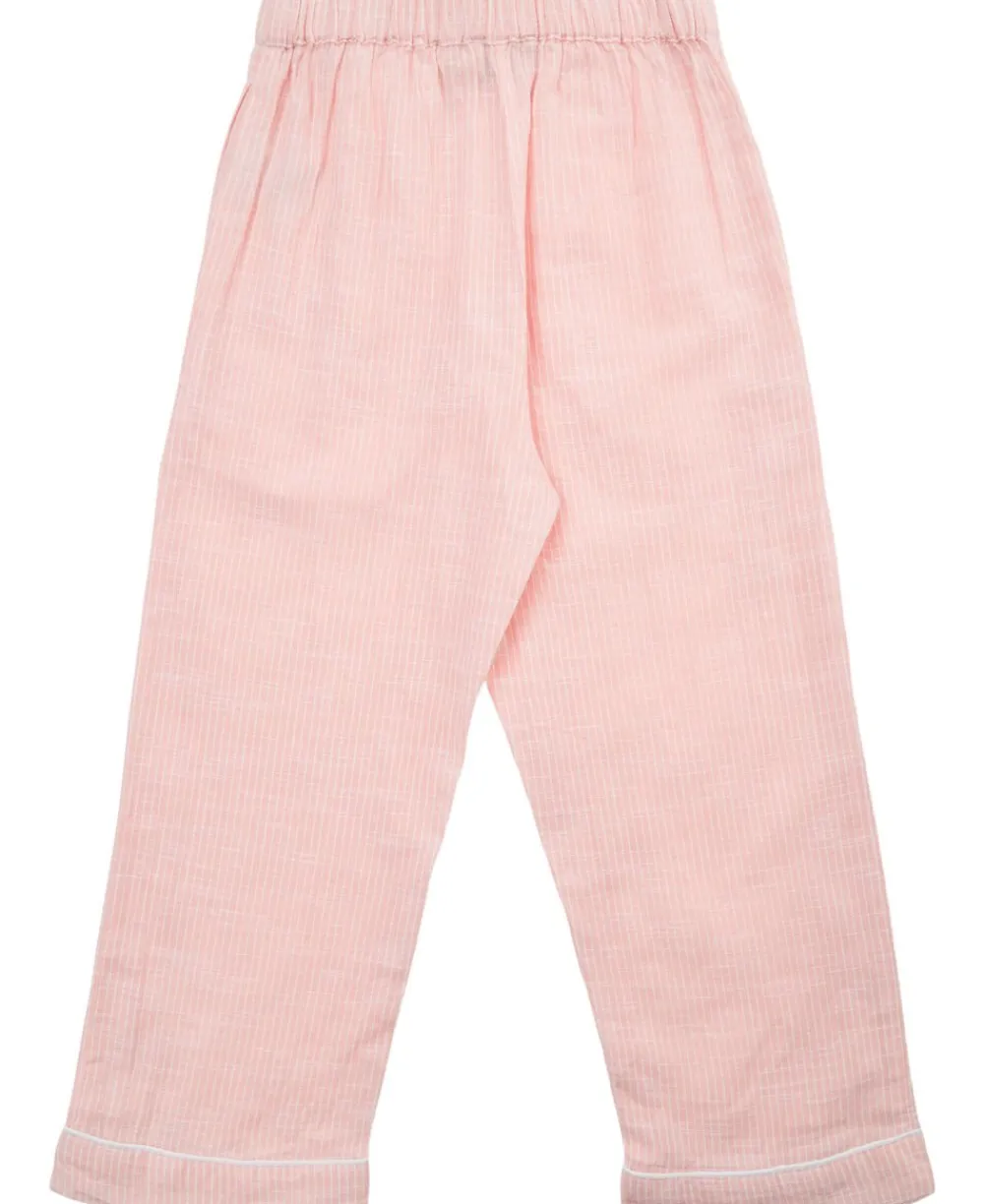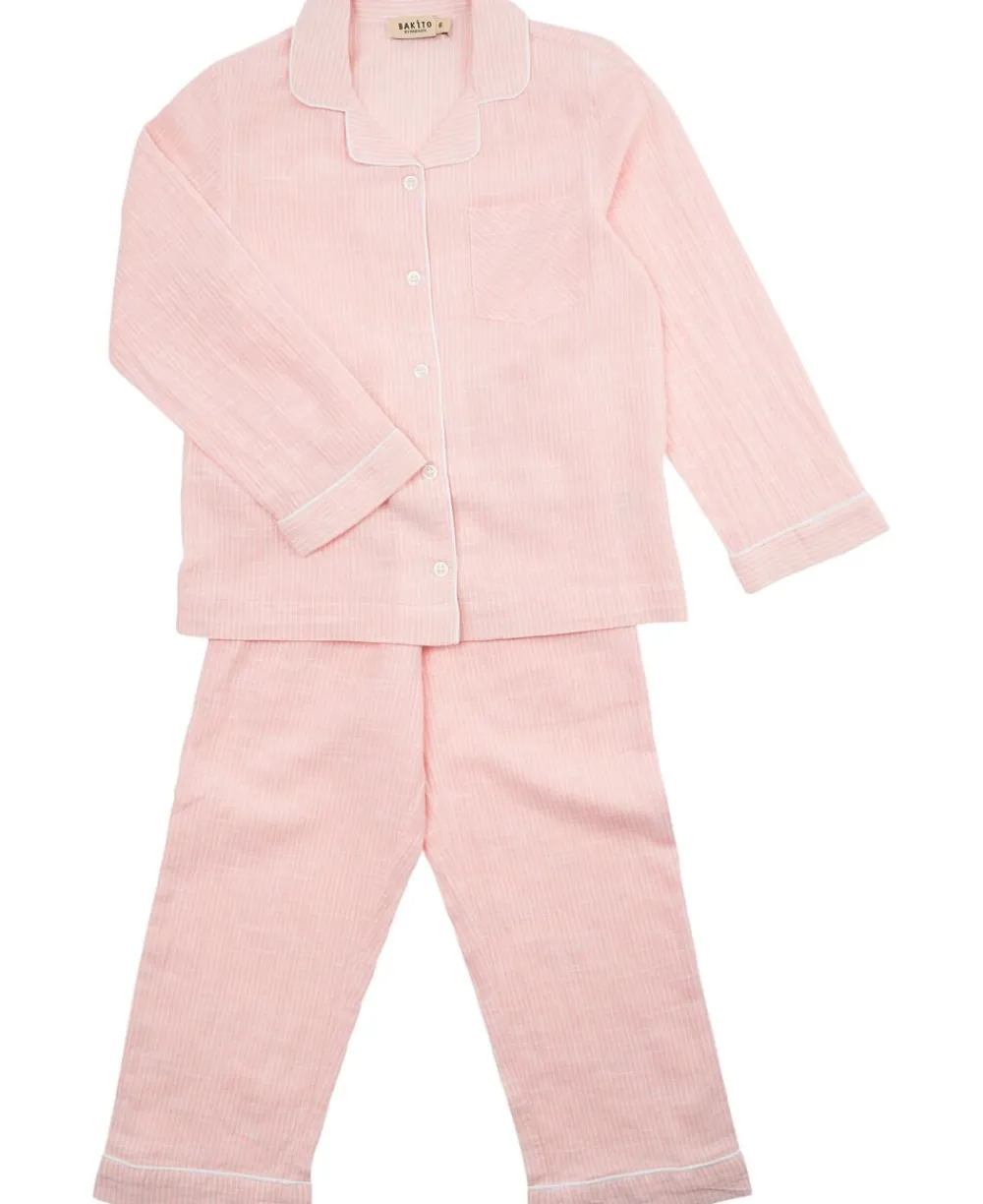 Pyjamas fra Magasin du Nord Collection i den blødeste kvalitet af 100% økologisk bomuld med GOTS-certificering. Sættet består af en langærmet skjorte og et par bukser med et fint, stribet mønster, ’piping’-detaljer samt en løs pasform. Bukserne har sidelommer samt elastik og snøre i taljen. Skjorten har en enkelt brystlomme, en åben krave samt knaplukning på fronten. En skøn pyjamas i den absolut lækreste kvalitet.