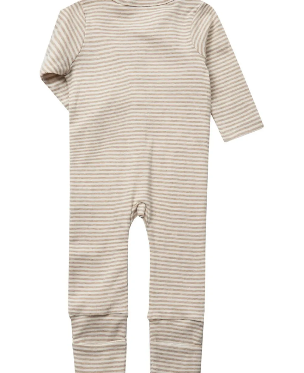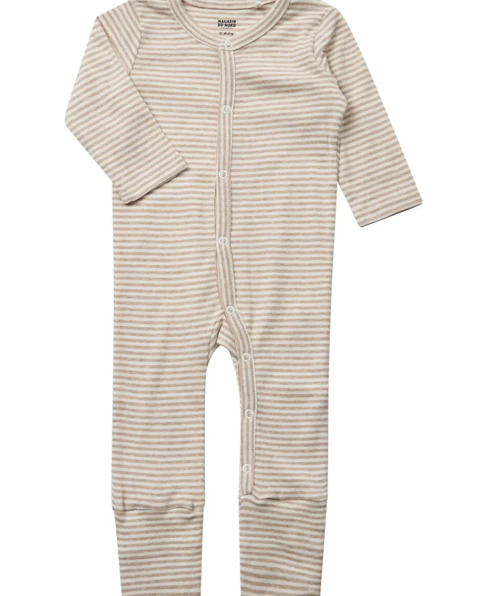 Bodysuit fra Magasin du Nord Collection i den blødeste kvalitet af 100% økologisk bomuld med GOTS-certificering. Bodyen er enkel i modellen med smalle striber, lange ærmer og ben, komfortable ribkanter, en ekstra foldbar kant ved benene samt trykknaplukning på fronten og ned langs det ene ben. En skøn dragt i den lækreste kvalitet.