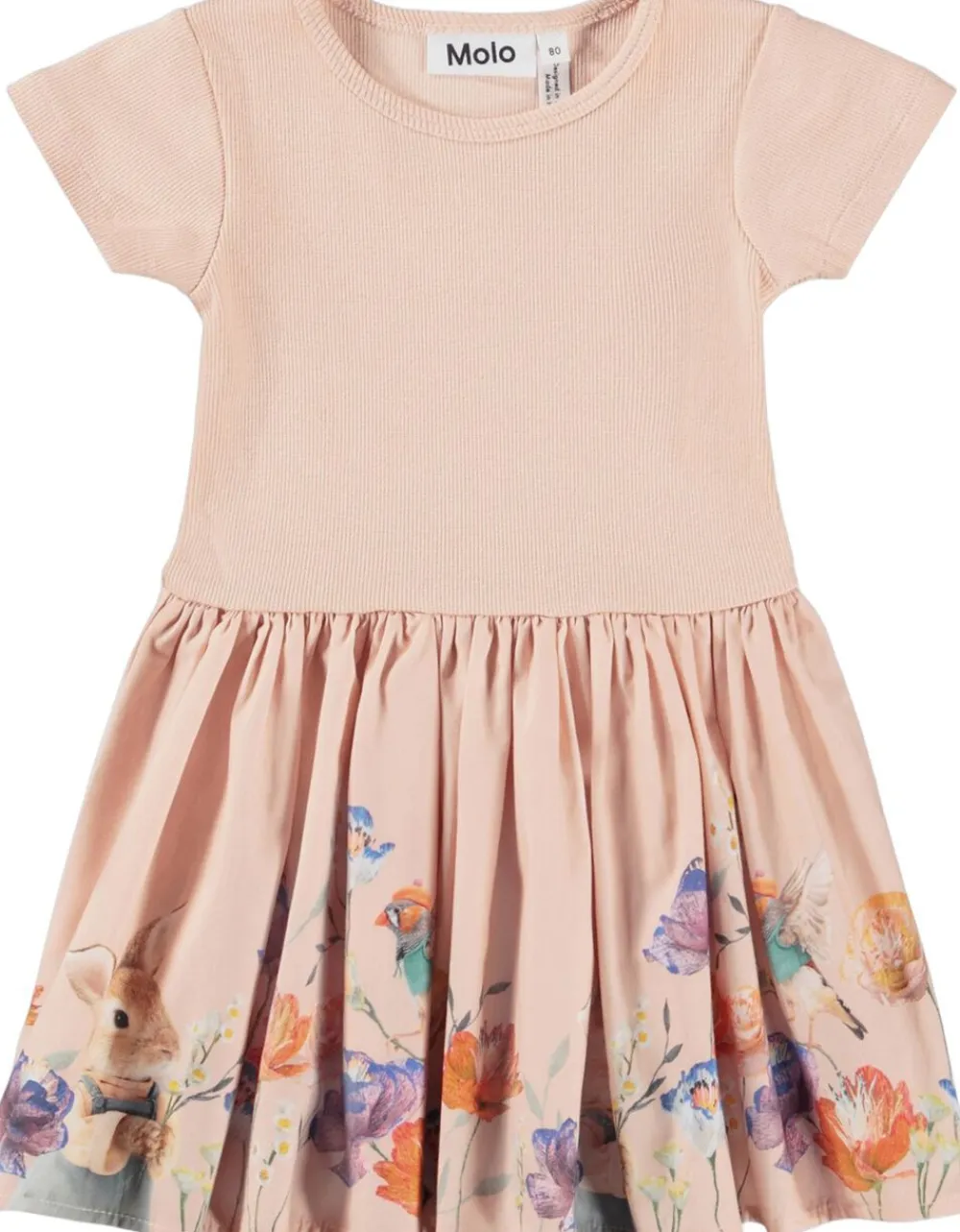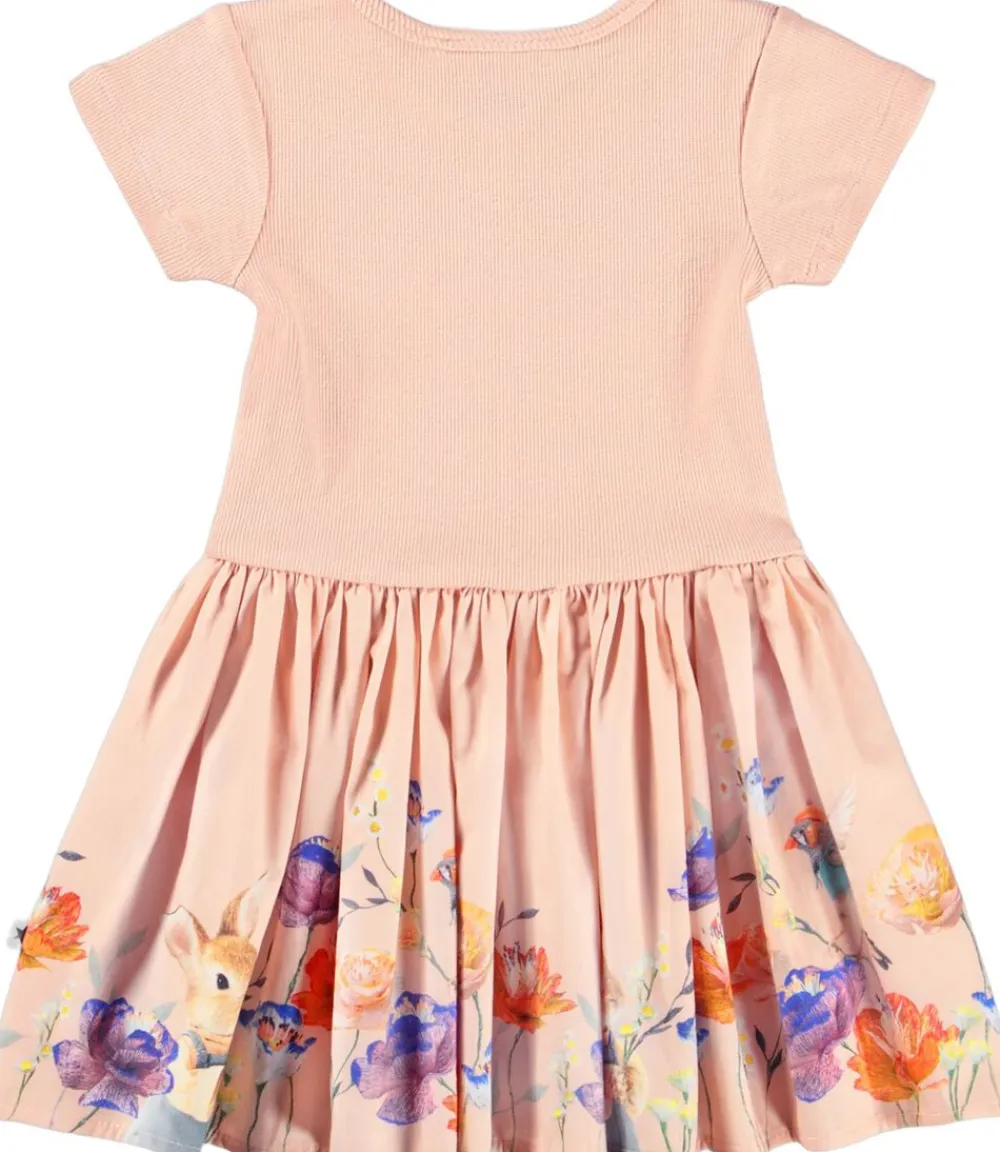 Denne rosa kjole fra Molo er lavet i økologisk bomuldjersey og har et print af fine dyr og smukke blomster. Toppen er tætsiddende i ribbet jersey, mens skørtet er i poplin, hvilket giver kjolen volumen.