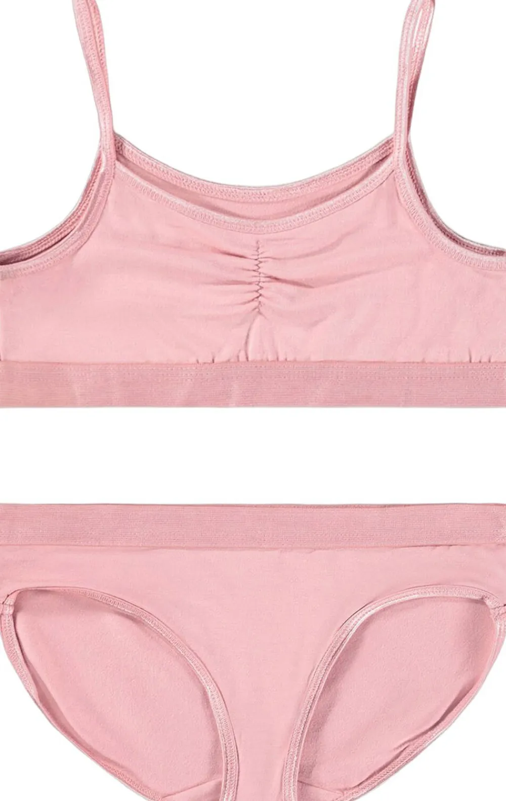 Lyseblåt undertøj i blød og strækbar viskose. Toppen har smalle, elastiske stropper og en rynket søm foran, som giver et elegant snit. Både top og underdel er udstyret med en bred elastikkant, der sikrer en god pasform og høj komfort.