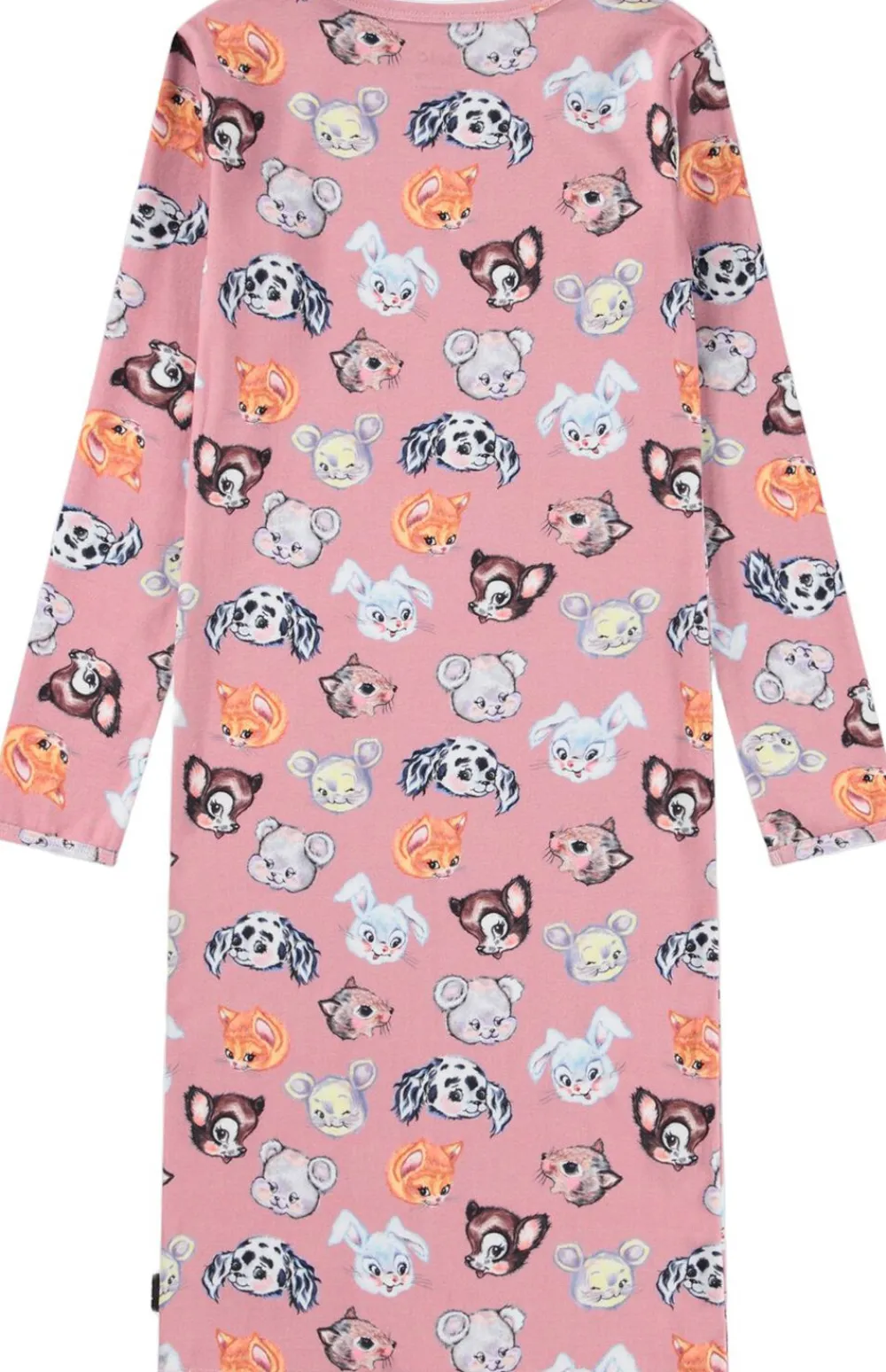 Denne lyserøde natkjole fra Molo er lavet af økologisk bomuld med et smilende ansigt-print. Kjolen har lange ærmer, en rund halsudskæring og en løs pasform.