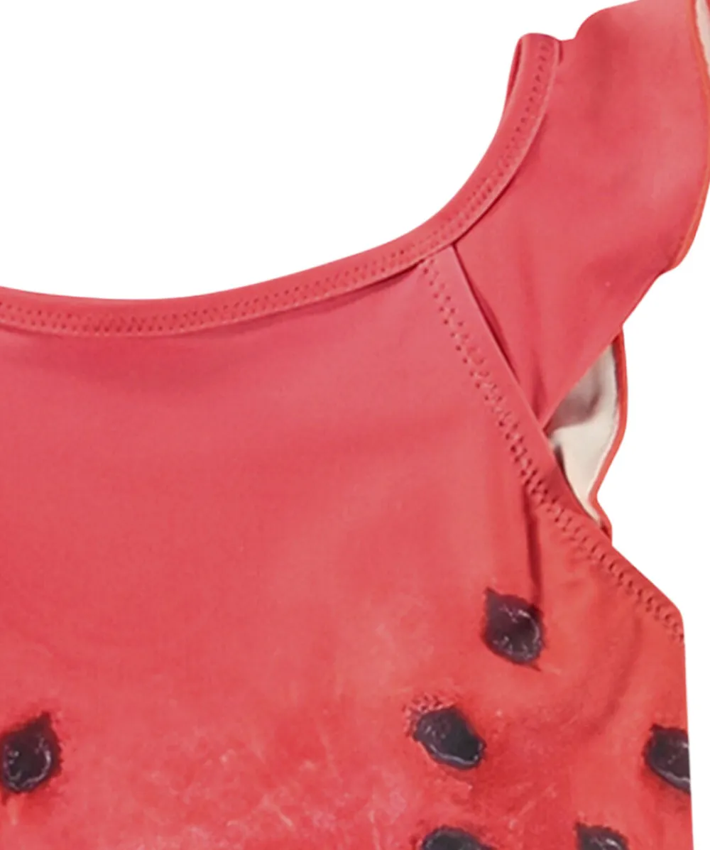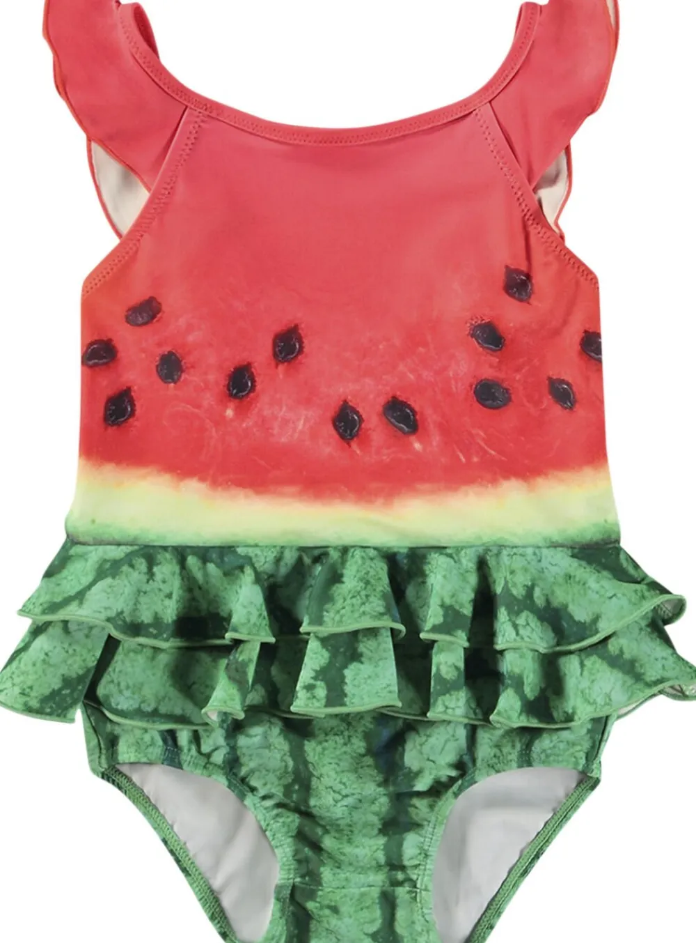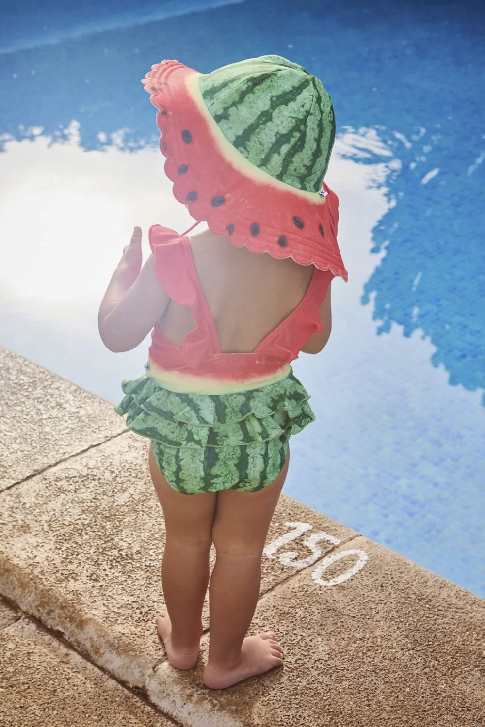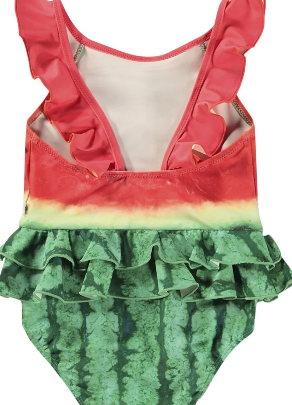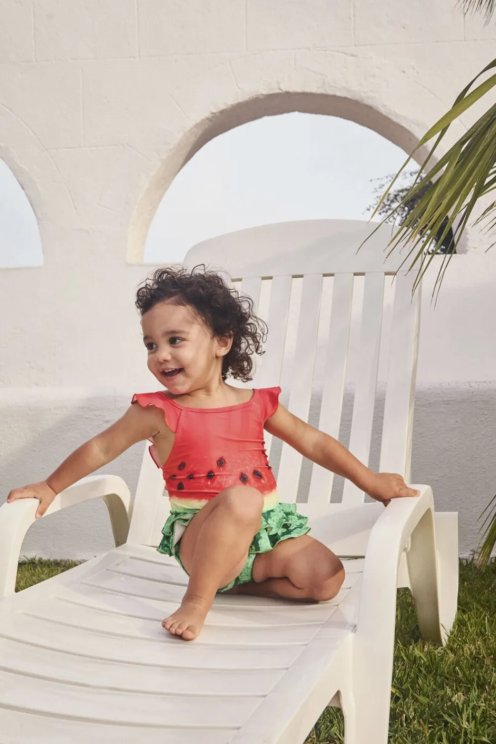 Badedragt til de mindste i genanvendt polyester med UV-beskyttelse 50+. Badedragten har dekorative flæsedetaljer, en dyb ryg, elastik omkring lårene samt en foret underdel, der giver plads til en ble.