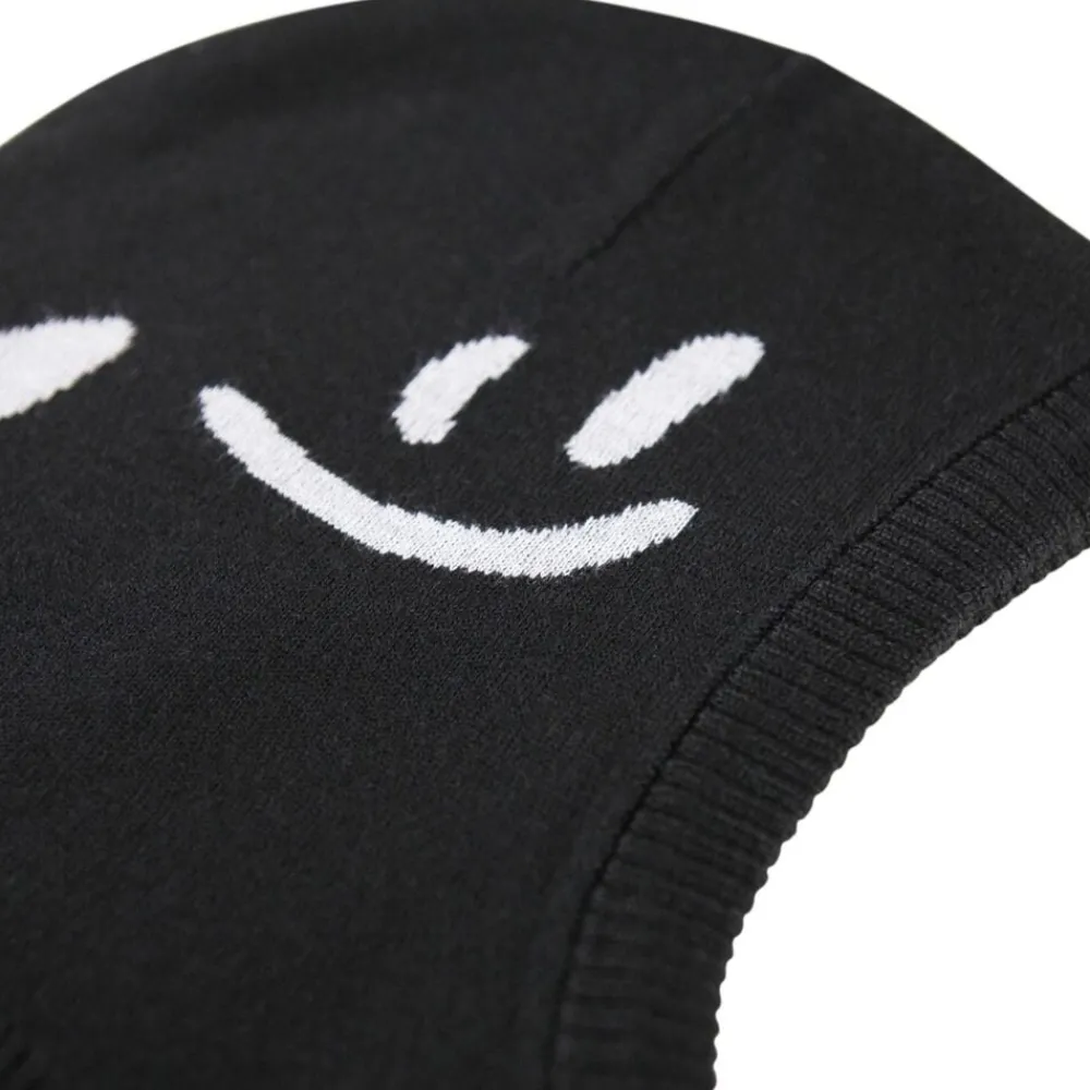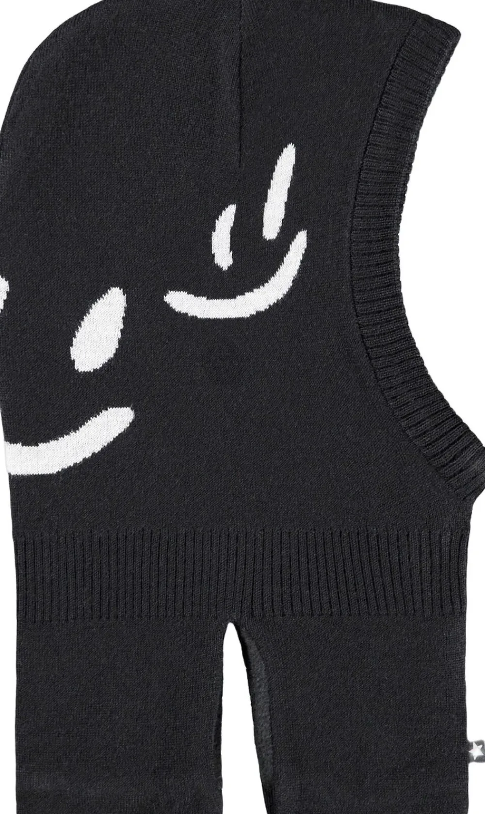 Elefanthue fra Molo med beige smilende ansigter. Huen har indsnit ved halsen, der sikrer, at den sidder til over bryst og skuldre. Fremstillet i en blød uldblanding og foret med blødt fleecefor.