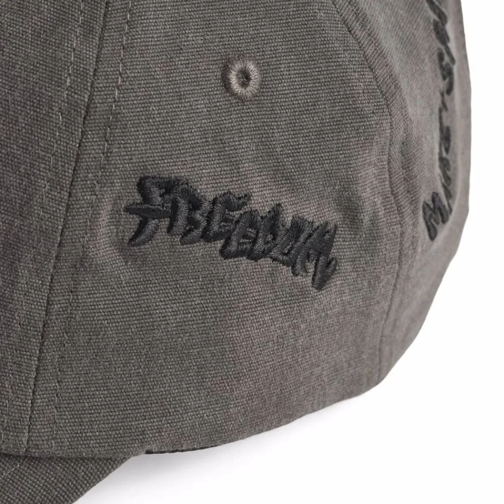Grå kasket fra Molo i bomuldsblanding med et vasket denim look, sorte broderier, en let bøjet skygge og justerbar lukning i nakken.