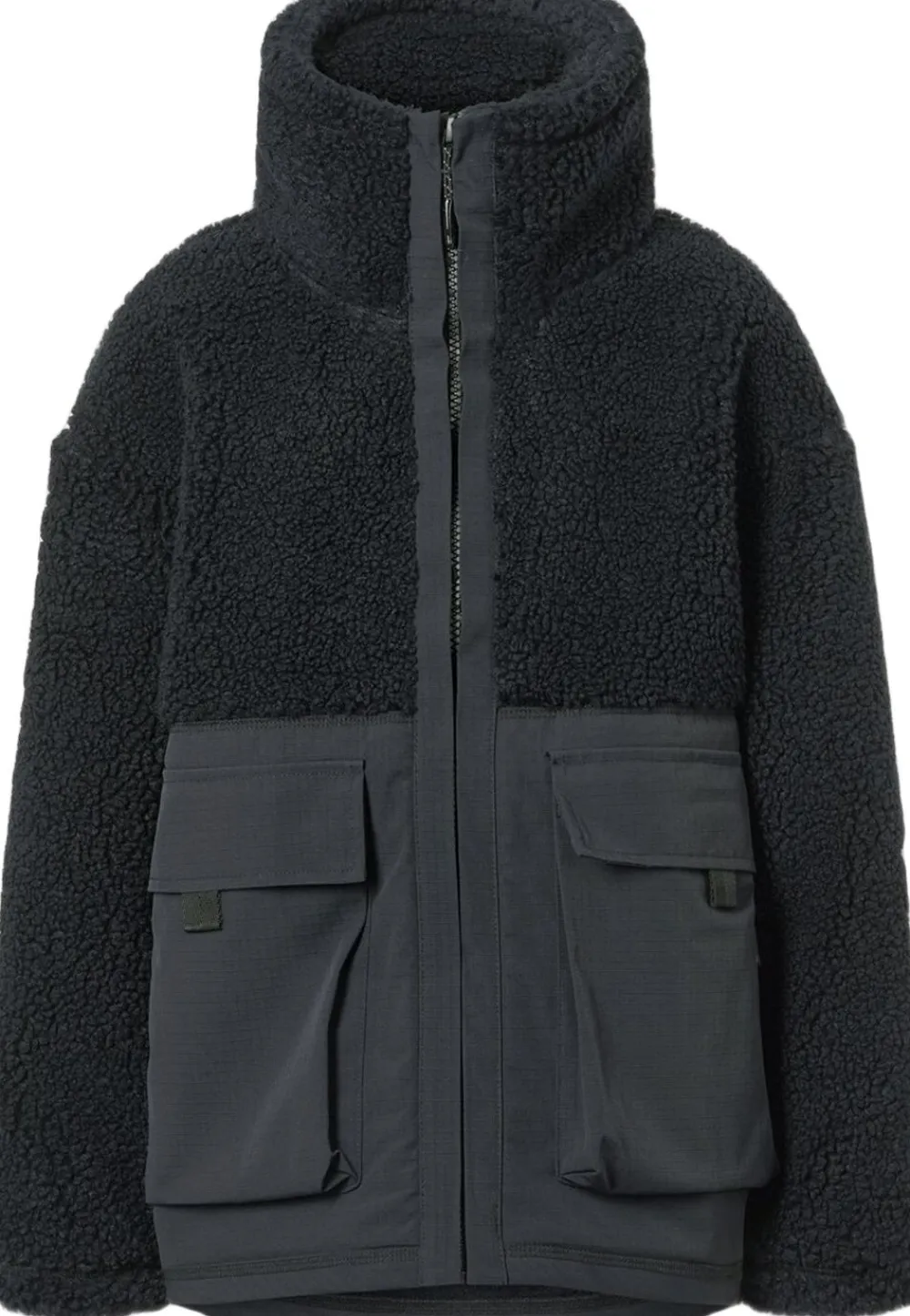 Denne sorte fleecejakke fra Molo er lavet i genanvendt polyester og har vind- og vandafvisende, slidstærke nylonpaneler på ærmer, ryg og frontlommer. Jakken har en høj krave og lynlåslukning på fronten.