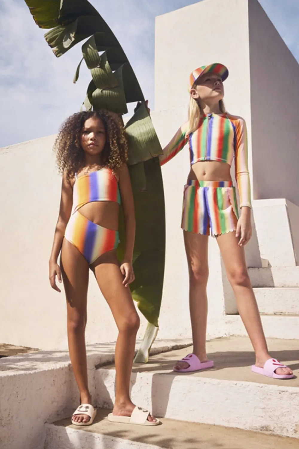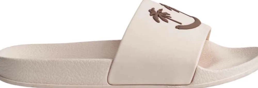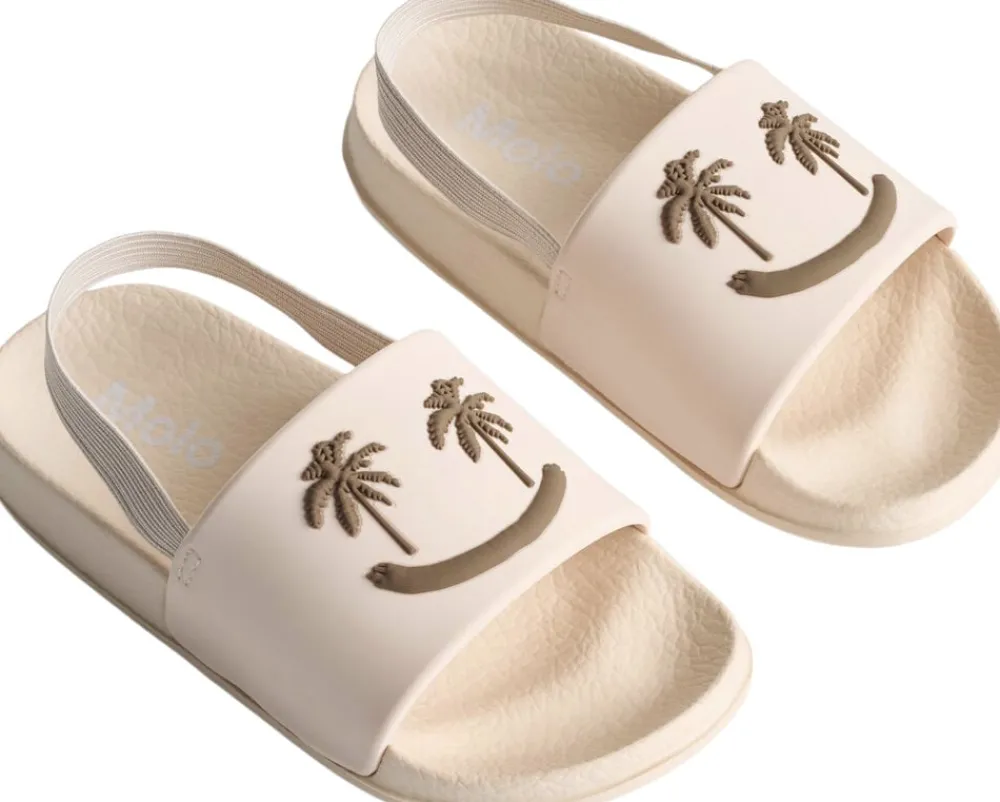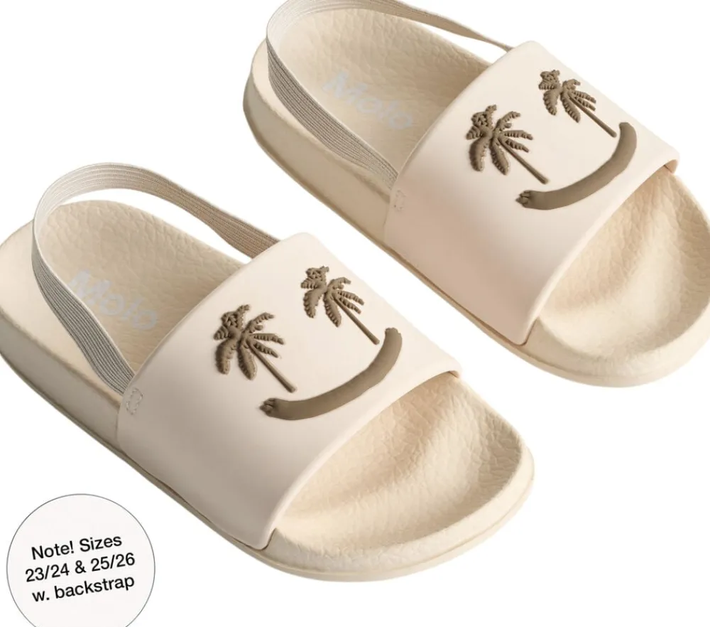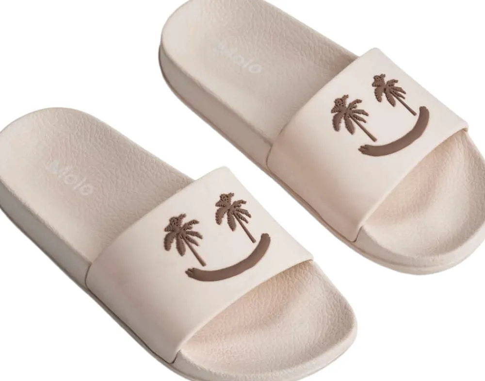 Badesandaler med bred fodrem og formstøbt indersål. Disse sandaler er vandafvisende og ideelle til både poolen og stranden. Fodremmen prydes af et smilende ansigt med palmeøjne.