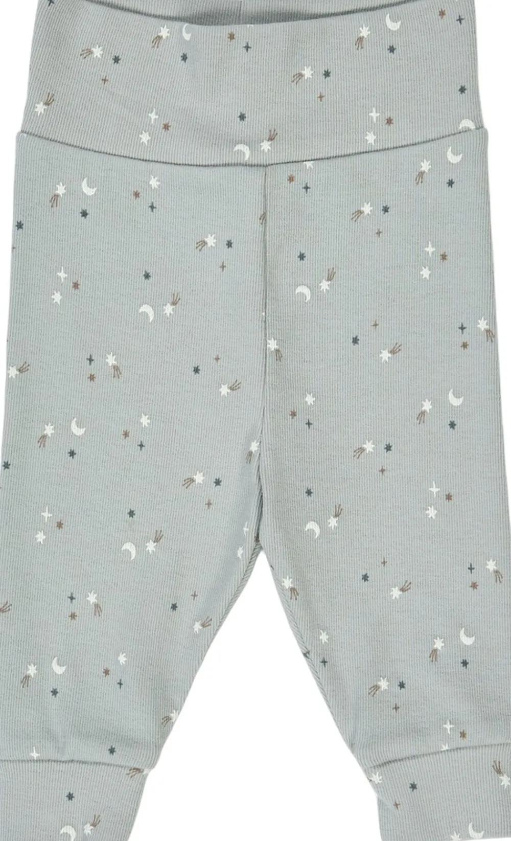 Dejlig bløde bukser til de mindste. Smukt gennemgående print af stjerner. Bukserne har en bred og elastisk kant foroven som kan foldes efter behov og stil. I ben-afslutningen er der foldbare fødder, så du kan folde bukserne så de små fødder ikke bliver kolde. Bukserne er lavet fra str. 44-74 så de passer meget små børn. Fremstillet i dejlig blød bomulds-rib med elastan for optimal pasform (GOTS Organic Certified by Ecocert Greenlife Lic. No. 151714). Produktet er GOTS organic- certificeret, hvilket betyder at bomulden er certificeret økologisk, og at der i alle andre processer som farvning, strikning og syning er taget de strengeste hensyn til miljøet. GOTS er internationalt anerkendt som den førende standard for forarbejdning af tekstiler af økologisk bomuld. Derudover tages der også hensyn til arbejdsforholdene, hos dem der producerer tøjet. Økologisk bomuld 95%, Elastan 5%