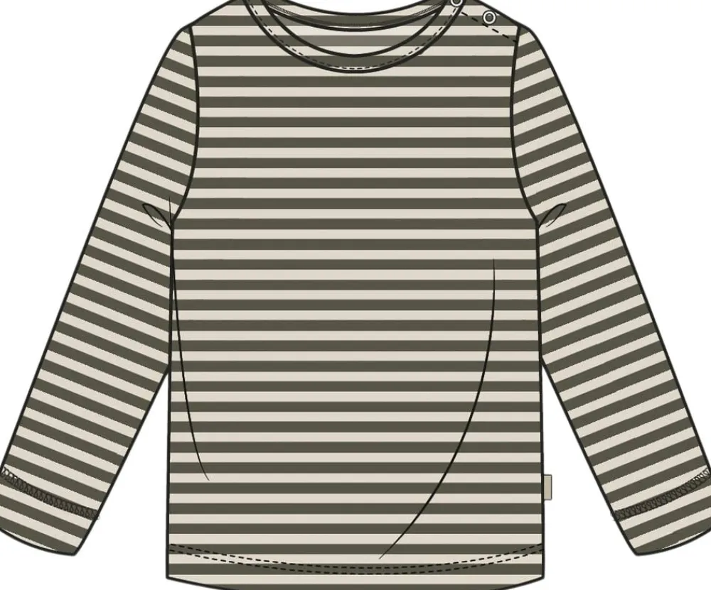 Langærmet bluse i vores klassiske stribede rib kvalitet. Str. 74-92 har trykknapper i skuldersømmen for nemt tøjskift. Str. 98-122 har ikke trykknapper i skuldersømmen. Materialet er blødt og meget strækbart, designet til komfort og leg. Produceret i Indien.