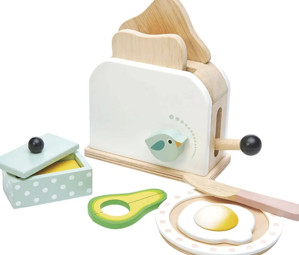 Rist de 2 skiver brød, drej minuturet, pop dem op med håndtaget, når de er klar, smør toasten med trækniven og top med et pocheret æg og 2 skiver avocado.