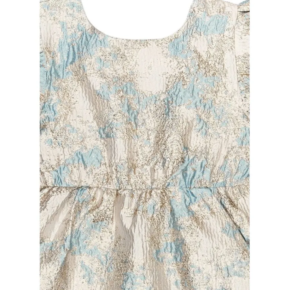 En smuk og elegant kjole fra THE NEW med et eksklusivt brokademønster i gyldne og blå nuancer. Kjolen har en let A-formet silhuet, der skaber en fin og luftig bevægelse. De korte pufærmer og den elastiske talje tilføjer et feminint touch og en behagelig pasform. Som en ekstra detalje har kjolen en lille åbning på ryggen med elastik, der giver et stilfuldt og moderne udtryk. – Let A-formet pasform. – Skinnende brokademønster i gyldne og blå nuancer. – Korte pufærmer for et elegant look. – Elastisk talje for en behagelig og fleksibel pasform. – Lille åbning på ryggen med elastik for en moderne detalje.