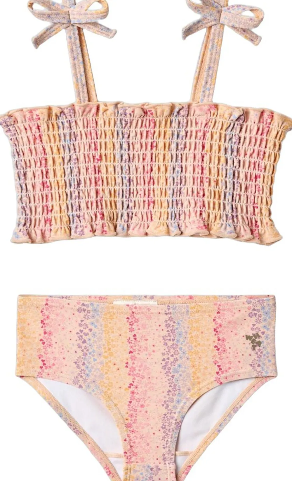 Skøn biniki med smockdetaljer til børn. – Overdel: Smockdetaljer samt tynde stropper med sløjfer – Underdel: Elastik i taljen – Håndtegnet signaturprint Denne bikini er perfekt til en varm dag på stranden, ved poolen, i haven eller blot i svømmehallen. Bikinioverdelen har tynde stropper med en fin lille sløjfe på toppen. Underdelen har elastik i taljen for god komfort. Al badetøj er overvejende produceret i genanvendt polyester, og er Standard 100 fra OEKO-TEX® certificeret. Forlæng dit badetøjs levetid: – Ved altid at skylle dit badetøj efter badning i klor- eller saltvand. – Ved at følge vaskeanvisningerne — – Standard 100 fra OEKO-TEX® – 83% Genanvendt polyester, 17% ElastanSøt bikini med print og smockdetaljer for barn. – Smockdetaljer – Wheat-signaturprint – Smale skulderstropper med små sløyfer Wheats bikini passer perfekt til en dag på stranden eller i svømmehallen. All badetøyet vårt er hovedsakelig laget av resirkulert polyester, og er behagelig for barnet å ha på og bevege seg i. Slik tar du vare på badetøyet ditt: – Skyll alltid badetøyet etter bruk i klor- eller saltvann – Følg vaskeanvisningen — – Standard 100 by OEKO-TEX® – 83% Resirkulert polyester, 17% Elastan