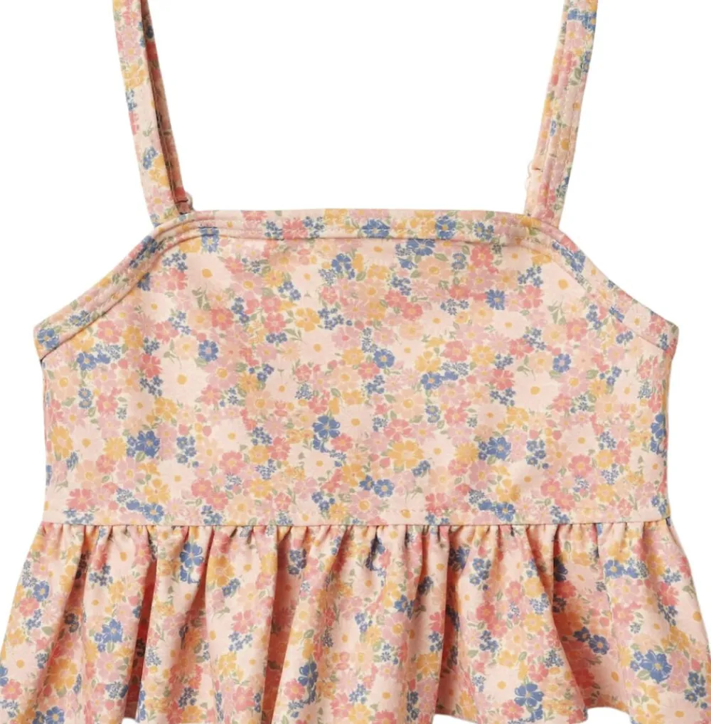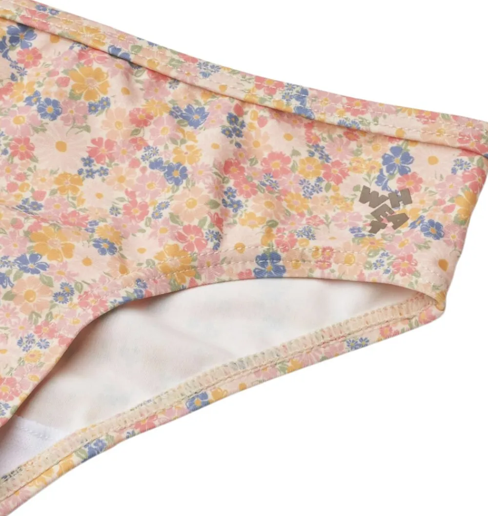 Skøn printet bikini med flæsedetalje til børn. – Figursyet Overdel: – Tynde skulderstropper – Bred flæse under brystet Underdel: – Elastik i hoften Wheat’s badetøj er perfekt til en dag på stranden eller i svømmehallen. Alt vores badetøj er primært lavet af genanvendt polyester og er behageligt for dit barn at have på og bevæge sig i. Stilen har UV-beskyttelse 40+/UPF 40+. Bikinitoppen har tynde stropper og en bred flæse nederst. Bikinibunden har en elastik i hoften. Bikinien kan nemt styles med en af vores lette kjoler eller skjorter for at fuldende det søde sommerlook. Forlæng dit badetøjs levetid: – Ved altid at skylle dit badetøj efter badning i klor- eller saltvand. – Ved at følge vaskeanvisningerne — – Standard 100 by OEKO-TEX® – 83% Genanvendt polyester, 17% Elastan – GRS certificeret