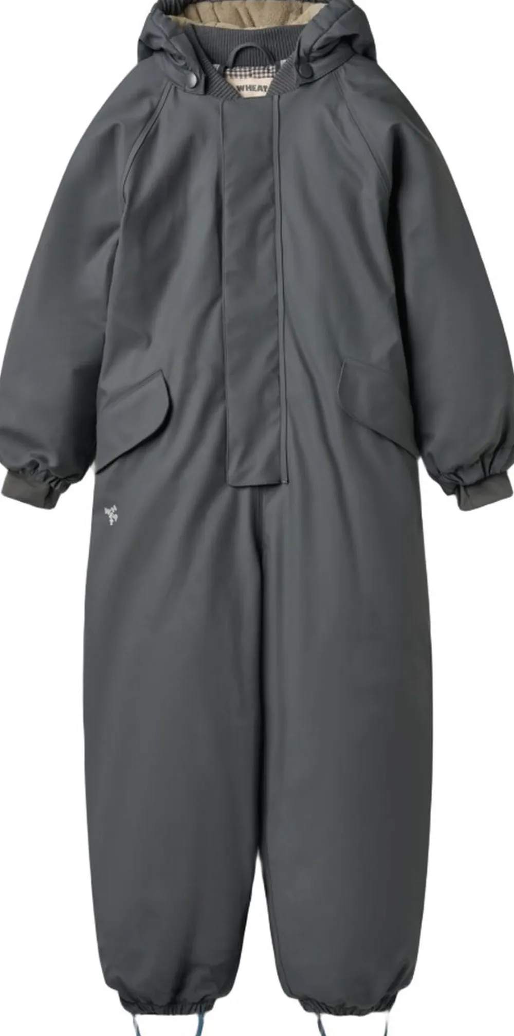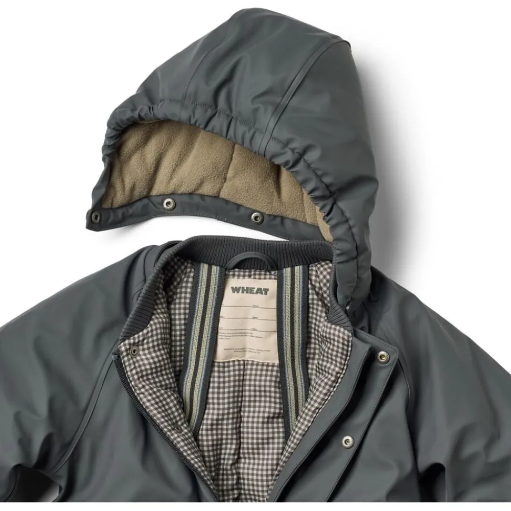 Skøn og uundværlig vinterdragt til børn. Den er åndbar, vandtæt og varm, da det er den perfekte kombination mellem en regndragt og en flyverdragt. – Normal pasform – Printet foer – Aftagelig og justerbar hætte – Elastiske seler – Lommer med trykknapper – Skjult lynlås ned foran – Aftagelige gummistropper under fødderne – Vindmanchetter med hul til tommelfingeren samt elastikker ved håndleddet – Elastik i benene, der lukker tæt om anklen – Reflekser Wheats vinterdragter er en perfekt blanding mellem den velkendte regndragt og flyverdragt. Denne dragt har en tykkere vinterpolstring, som gør den varm på selv de koldeste og vådeste vinterdage. Vinterdragten er lavet i åndbart polyurethan (PU) materiale og er derfor ganske unik, da den kan holde dit barn både tørt og varmt på én og samme tid. — Tekniske funktioner: Vandsøjletryk: 9. 000 mm Åndbarhed: 600 g/m2/24 t Standard 100 by OEKO-TEX® PFC-fri Florin-fri Vandtæt lynlås Alle sømme er vandtætte og forseglet — Yder materiale: 100% Genanvendt polyester i åndbart PU (polyurethan belægning) Isolering: 100% Genanvendt polyester Quiltet foer: 100% Genanvendt polyester
