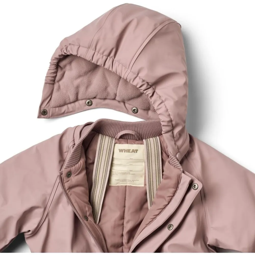 Skøn og uundværlig vinterdragt til børn. Den er åndbar, vandtæt og varm, da det er den perfekte kombination mellem en regndragt og en flyverdragt. – Normal pasform – Printet foer – Aftagelig og justerbar hætte – Elastiske seler – Lommer med trykknapper – Skjult lynlås ned foran – Aftagelige gummistropper under fødderne – Vindmanchetter med hul til tommelfingeren samt elastikker ved håndleddet – Elastik i benene, der lukker tæt om anklen – Reflekser Wheats vinterdragter er en perfekt blanding mellem den velkendte regndragt og flyverdragt. Denne dragt har en tykkere vinterpolstring, som gør den varm på selv de koldeste og vådeste vinterdage. Vinterdragten er lavet i åndbart polyurethan (PU) materiale og er derfor ganske unik, da den kan holde dit barn både tørt og varmt på én og samme tid. — Tekniske funktioner: Vandsøjletryk: 9. 000 mm Åndbarhed: 600 g/m2/24 t Standard 100 by OEKO-TEX® PFC-fri Florin-fri Vandtæt lynlås Alle sømme er vandtætte og forseglet — Yder materiale: 100% Genanvendt polyester i åndbart PU (polyurethan belægning) Isolering: 100% Genanvendt polyester Quiltet foer: 100% Genanvendt polyester
