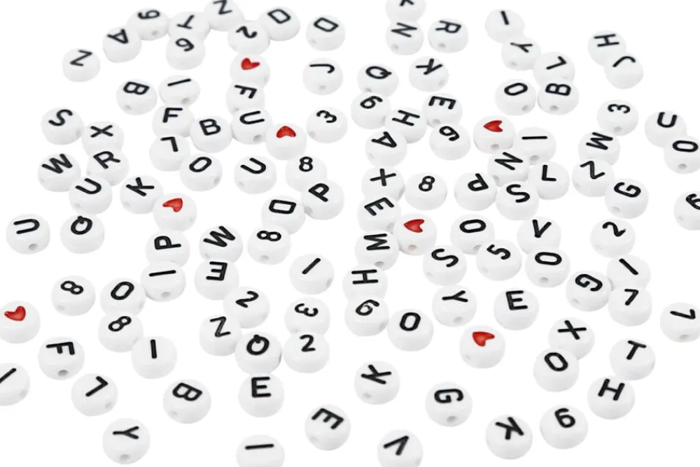 Runde perler med alfabetet (A-Z), talrækken og hjerter. Alle af hvid plast med præg og kulørt tryk på flad for- og bagside.