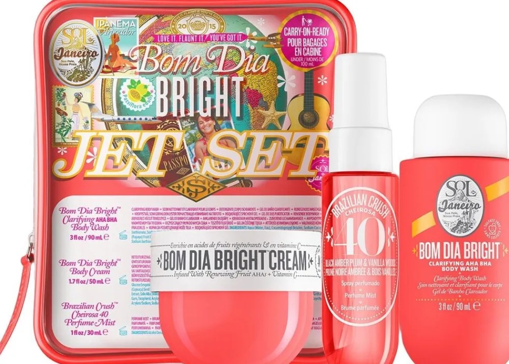 Den prisbelønnede Bom Dia Bright-creme, beriget med frugtsyrer og C-vitamin, genopretter hudens glød og blødhed sammen med andre produkter i rejsestørrelse.