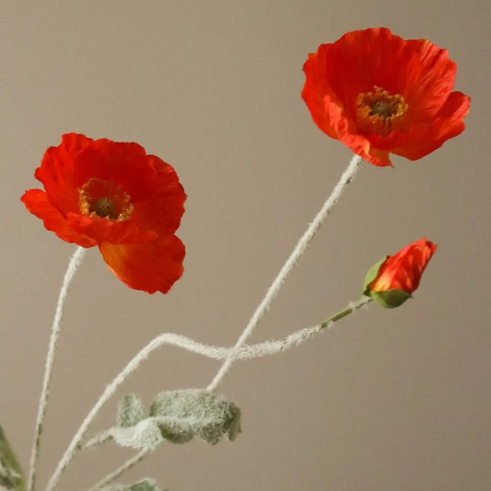 Denne mørke orange poppyblomst har tre åbne blomster og en lukket knop i en rig orange nuance med delikate, let krøllede kronblade. Blomsterne er fastgjort til en slank grøn stilk med teksturerede blade, der når en højde på 56 cm. Den store keramiske jordvase på billedet måler 30,5 cm i højden og 10 cm i diameter.