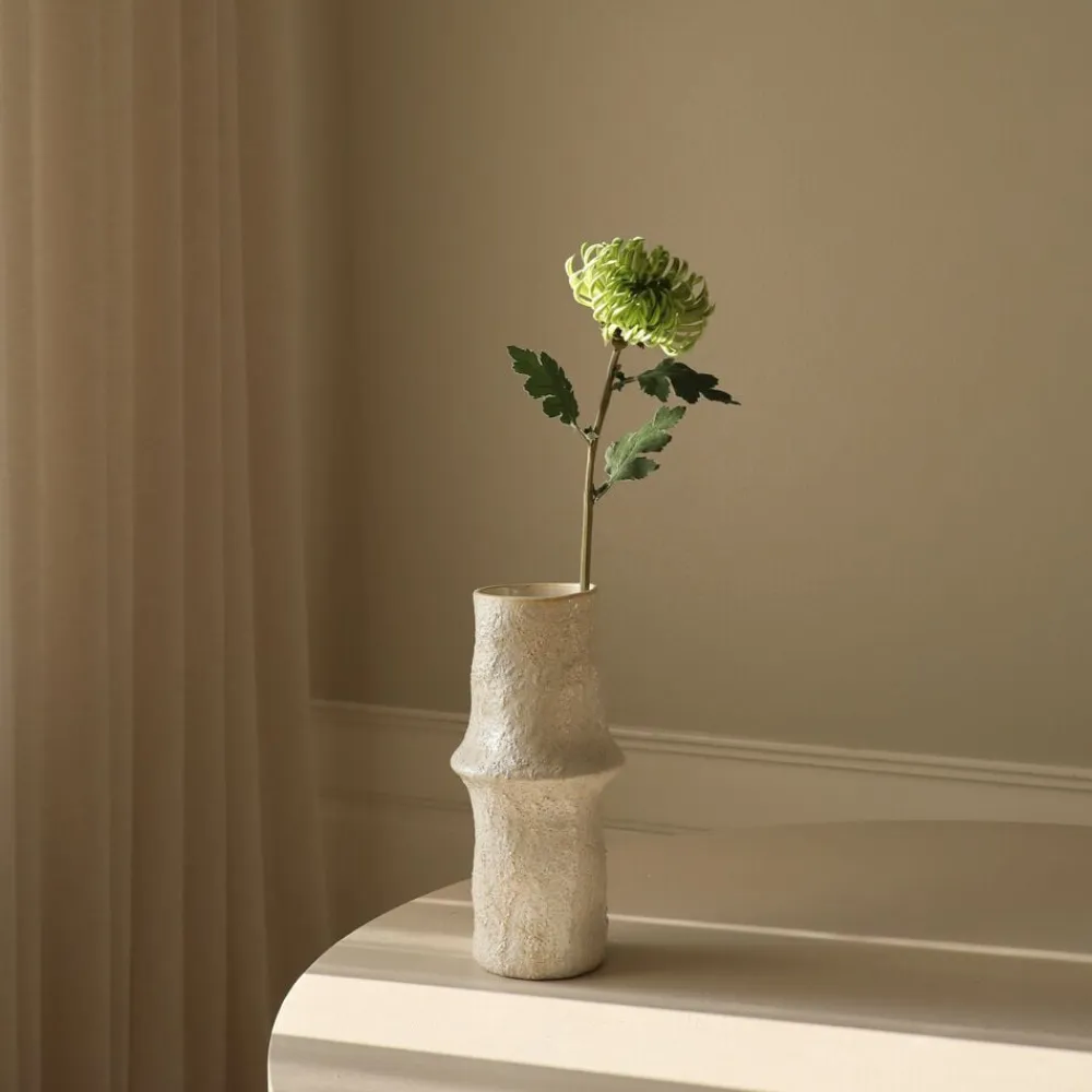 Denne lysegrønne halvkaktus Dahlia-blomst har fint krøllede kronblade i en frisk grøn nuance, der danner en struktureret og tekstureret blomst. Blomsten understøttes af en slank, let tekstureret stilk med en dæmpet grøn tone, der måler 60 cm i højden, ledsaget af brede, dybt lobede blade med en mat overflade.Ê Den store keramiske jord Vase, der er vist på billedet, måler 30,5 cm i højden og 10 cm i diameter.