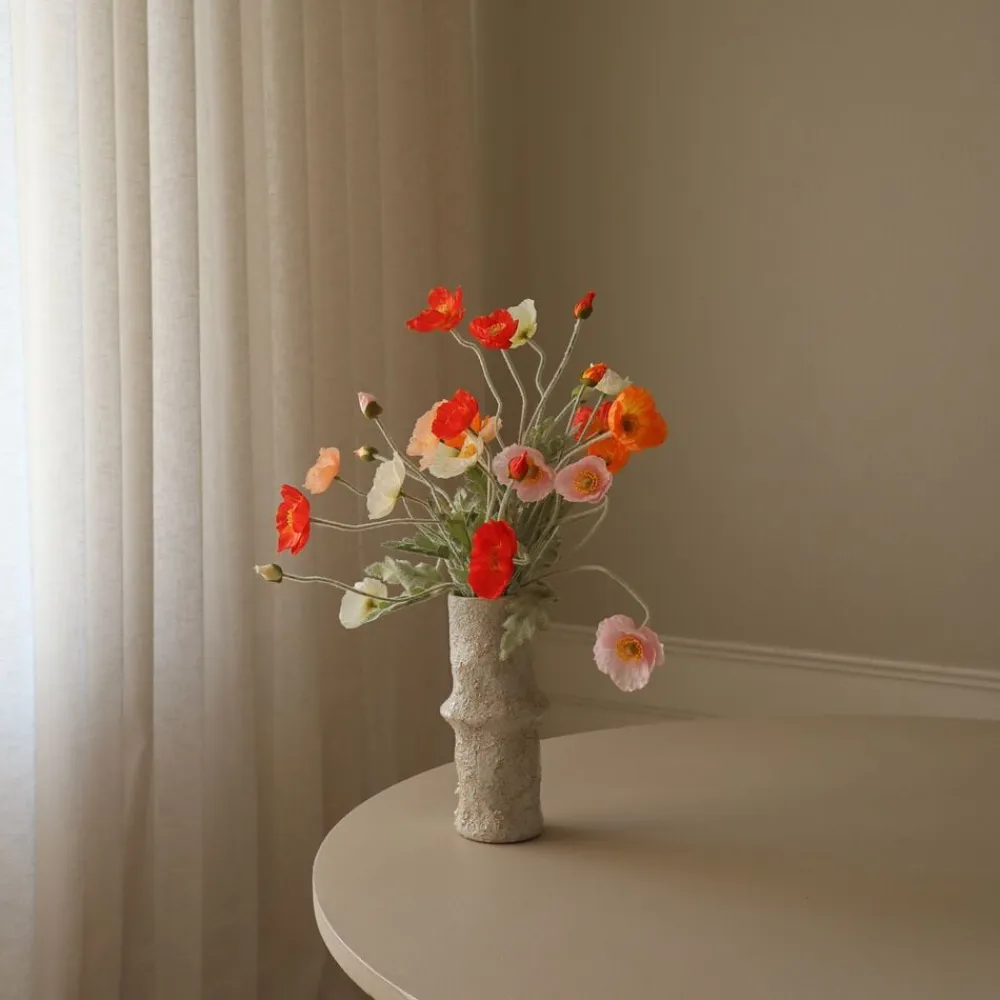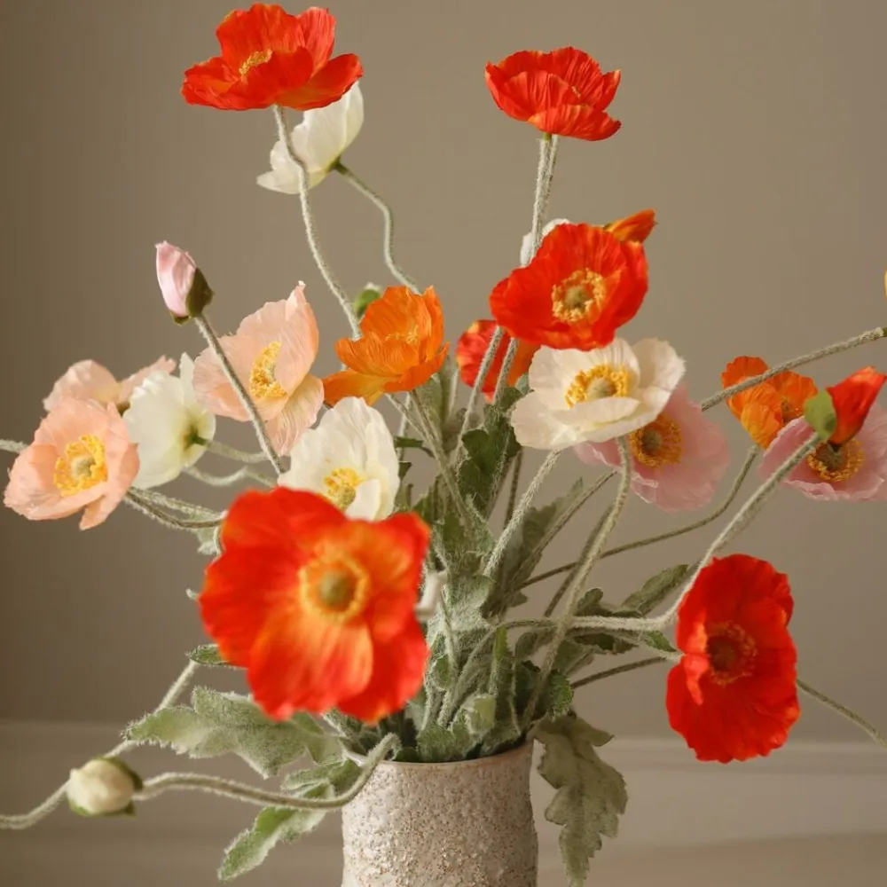 Denne buket brister med levende energi og blander bløde pasteller med dristige strejf af farve. De delikate kronblade og yndefulde stængler skaber en dynamisk og luftig sammensætning.ÊDenne buket indeholder i alt 8 stængler. Bourquetten når en højde på 56 cm på sit højeste punkt, men alle stilke kan let bøjes og justeres for at opnå den ønskede højde og form til ethvert arrangement. Den store keramiske jordvase på billedet måler 30,5 cm i højden og 10 cm i diameter.