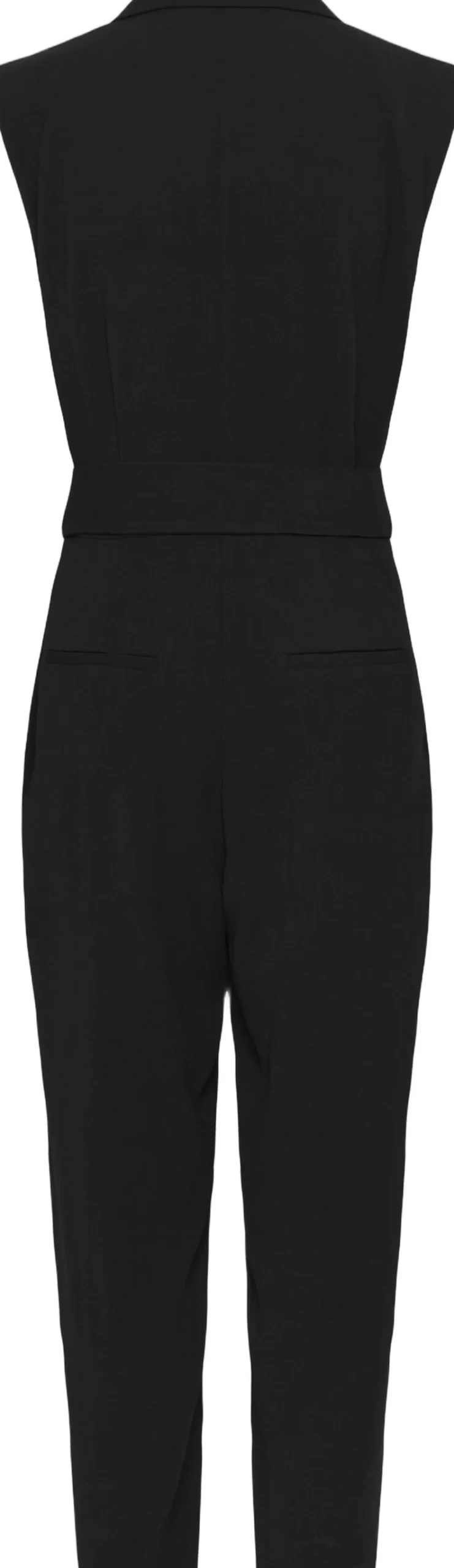 Ærmeløs buksedragt med figursyet pasform, reverskrave og bindebælte i taljen. De smalle ben og det enkle snit giver et moderne og elegant udtryk, perfekt til både arbejde og særlige lejligheder.