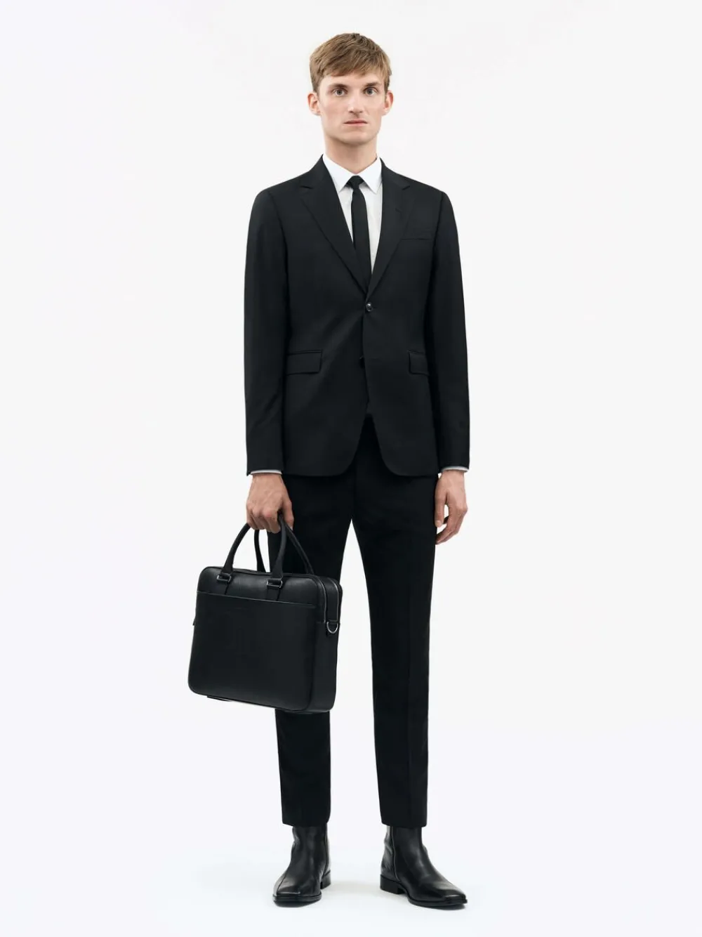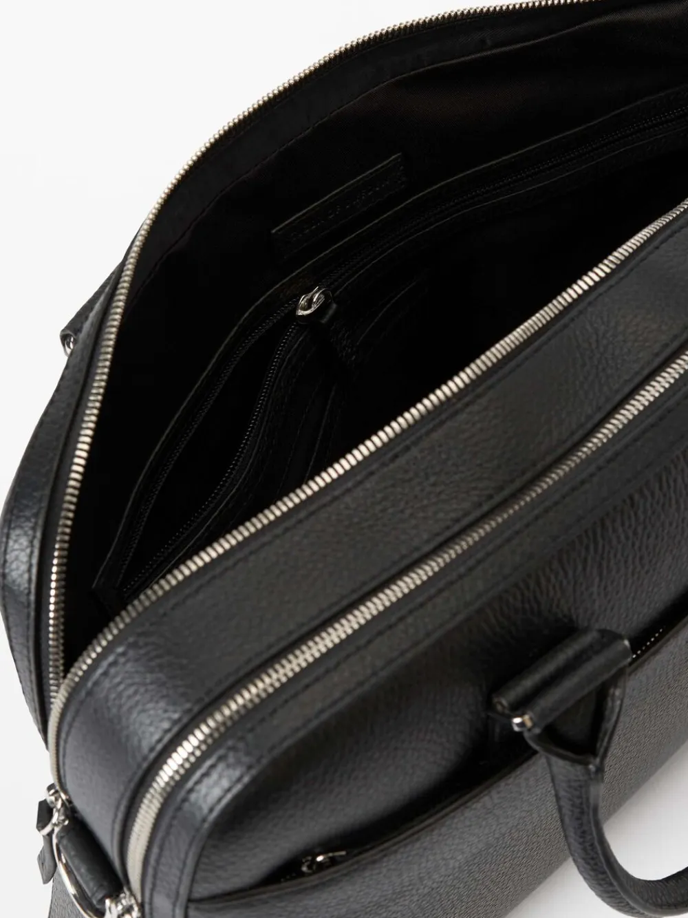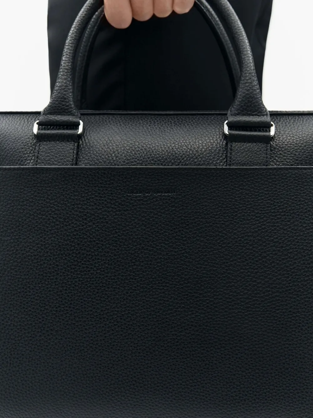 Briefcase in soft grainy leather. Two main zipped compartments. Concealed zipped pocket at the front. Trolley attachment strap at the back. Inside features one zipped pocket, two open welt pockets, one card slot, two pen slots. Detachable shoulder strap. Embossed Tiger of Sweden logo at front. Size: 29 x 40 x 7.5 cm. Fits a 15″” laptop