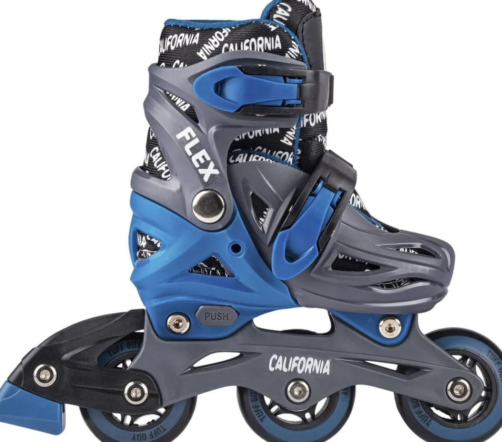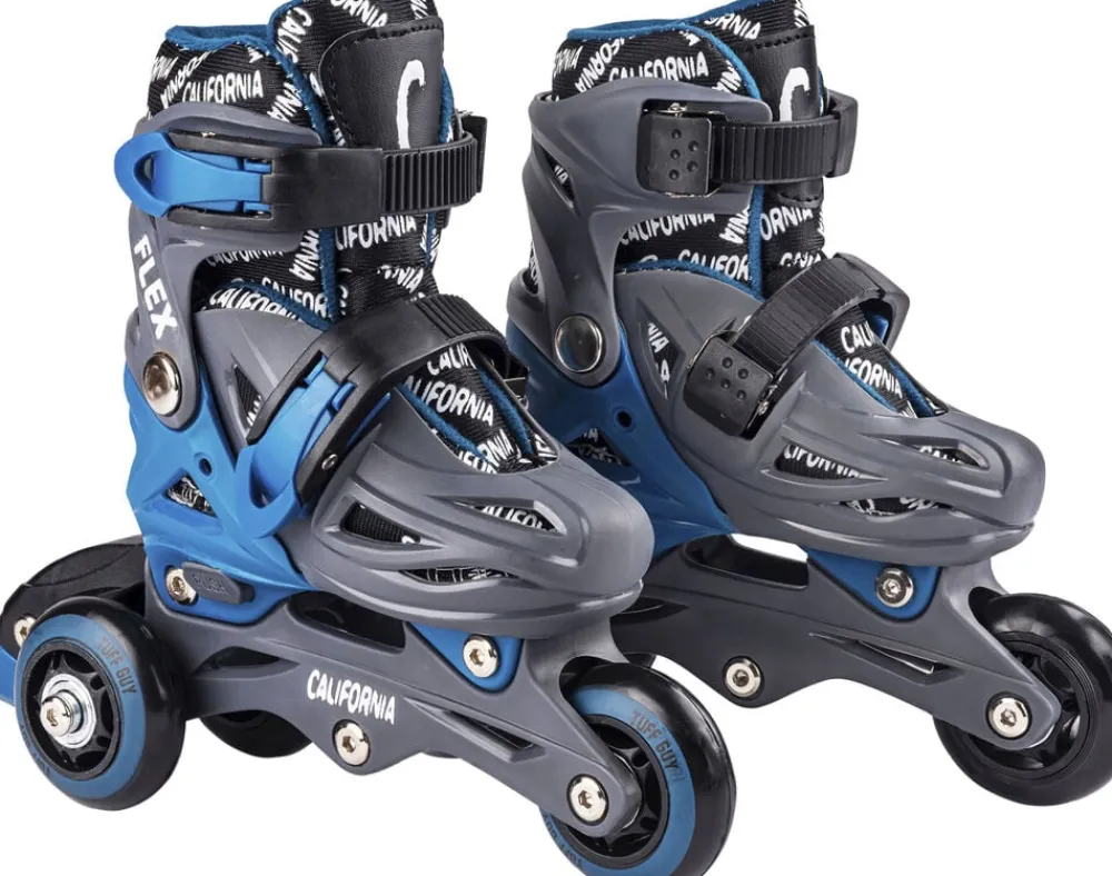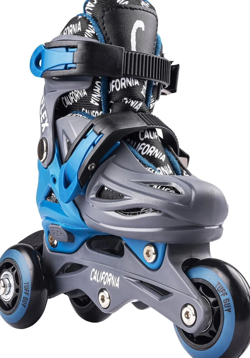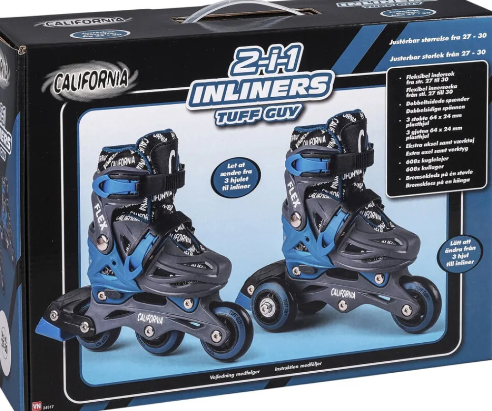 California TUFF GUY 2-i-1 inliners Fleksible inliners der kan justeres i størrelserne 27-30, 31-34 eller 35-38 Specifikationer: Str 27-30 kan ændres fra inliners til 3-hjulet Str 31-34 og 35-38 kan ændres fra inliners til side-by-side Dobbeltsidede spænder Støbte plasthjul 608z kuglelejer Bremseklods på én støvle 4 størrelser pr skøjte
