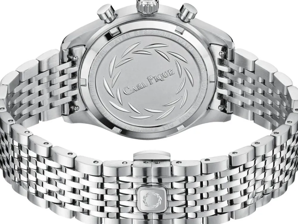 Carl Pique Maurice CP0060 uret kombinerer klassisk design med praktisk funktionalitet. Det har en rund urkasse og en detaljeret urskive med tre kronografer og en datovisning, der tilføjer dybde til udseendet. Den sorte urskive står i imponerende kontrast til den sølvfarvede urkasse og bezel. Uret er udstyret med kvarts urværk drevet af TMI VD54 kaliber.