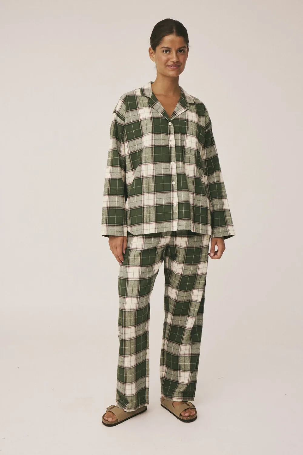 Pyjamasbukser fra Magasin du Nord Collection i den blødeste kvalitet af 100% økologisk bomuld med GOTS-certificering. Bukserne er enkle i modellen med det fineste, ternede print, elastik og snøre i taljen, sidelommer, en enkelt baglomme samt en løs pasform. Et par skønne pyjamasbukser i den absolut lækreste kvalitet.