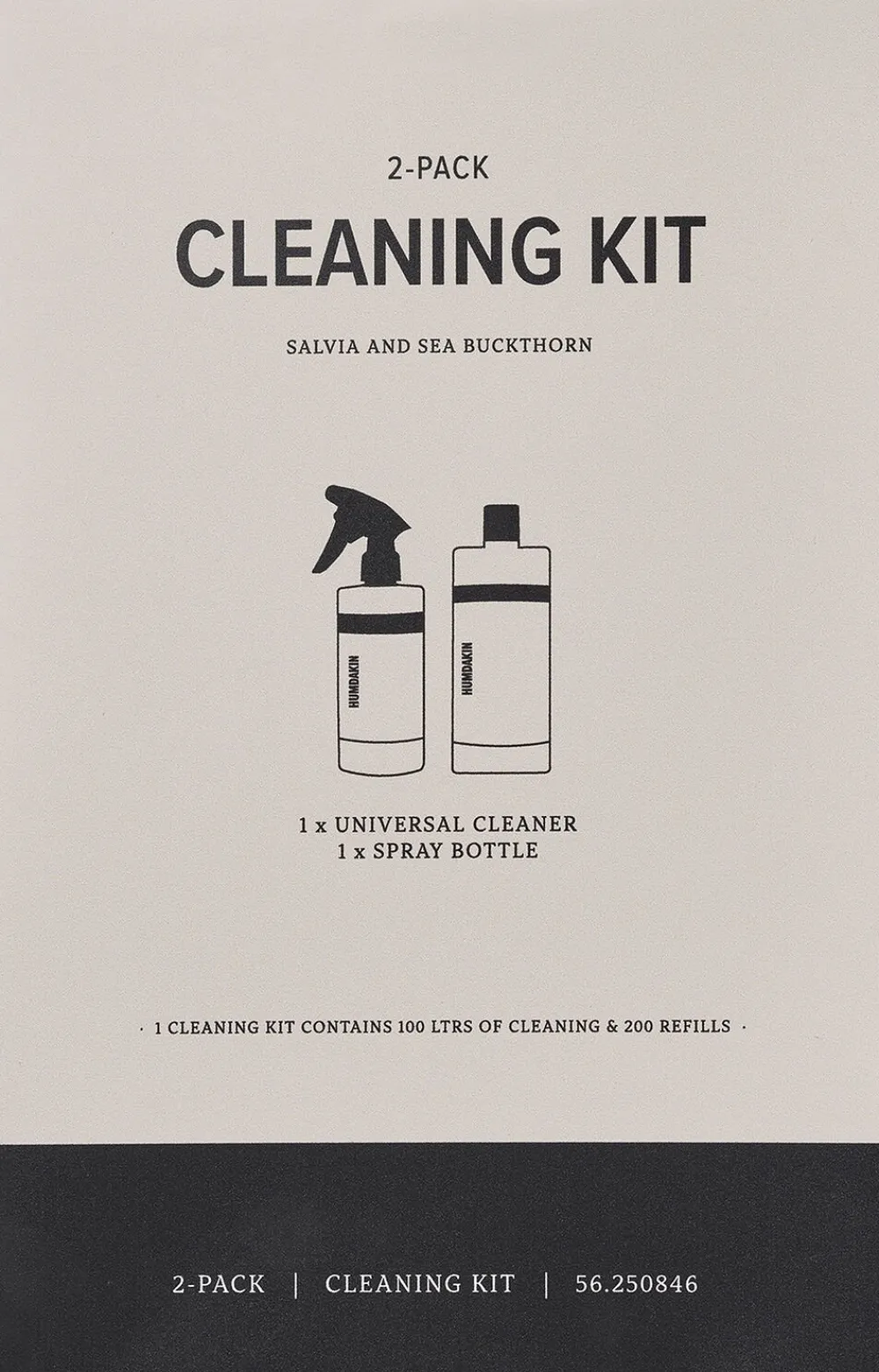 CLEANING KIT 1000 ml universalrengøringsmiddel + sprayflaske PET genanvendeligt plast Pakket i fin æske Nu er der ingen undskyldning for at springe en god rengøring over! I dette sæt får du alt, hvad du har brug for til bæredygtig rengøring- 1000 ml universalrengøringsmiddel og sprayflaske. I ét sæt har du i alt 100 liter rengøring, når du bruger den rigtige dosering. Universalrengøringsmidlet kan bruges på alle overflader, der tåler vand, f.eks. malede, træ- og keramiske overflader. Humdakin universal cleaner er beriget med antistatiske tilsætningsstoffer og naturlige ekstrakter fra havtorn og salvie for en blidere rengøringsoplevelse. Brug universalrengøringsmidlet regelmæssigt for at holde skidt og bakterier ude og dit hjem velduftende.